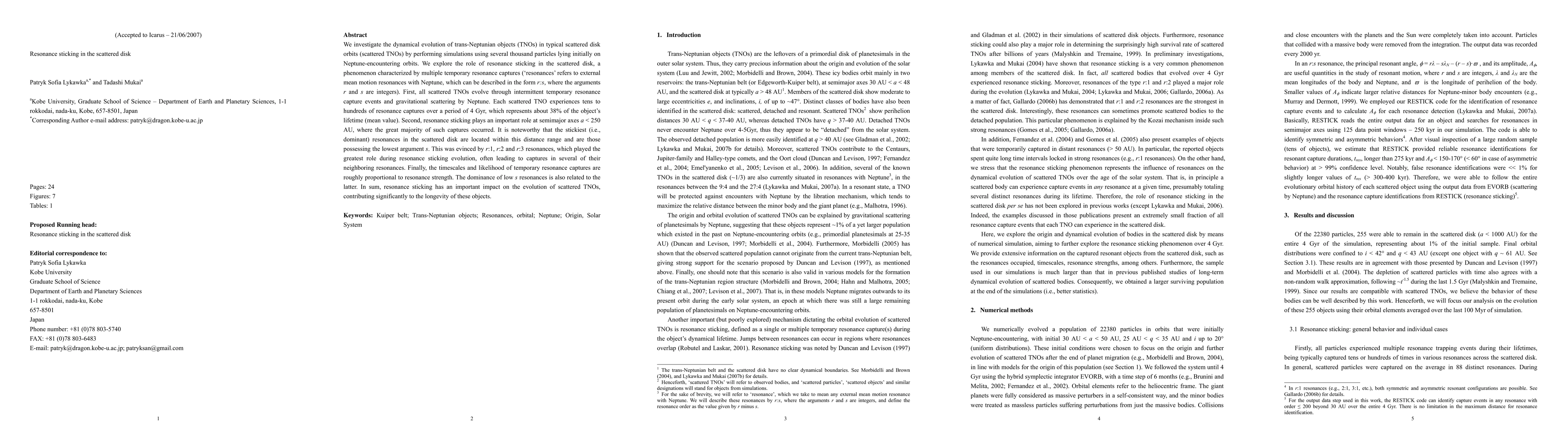 Research on scattered disk objects found that resonance sticking plays a significant role in their evolution, contributing to their longevity, and most captures occur at semimajor axes below 250 AU.