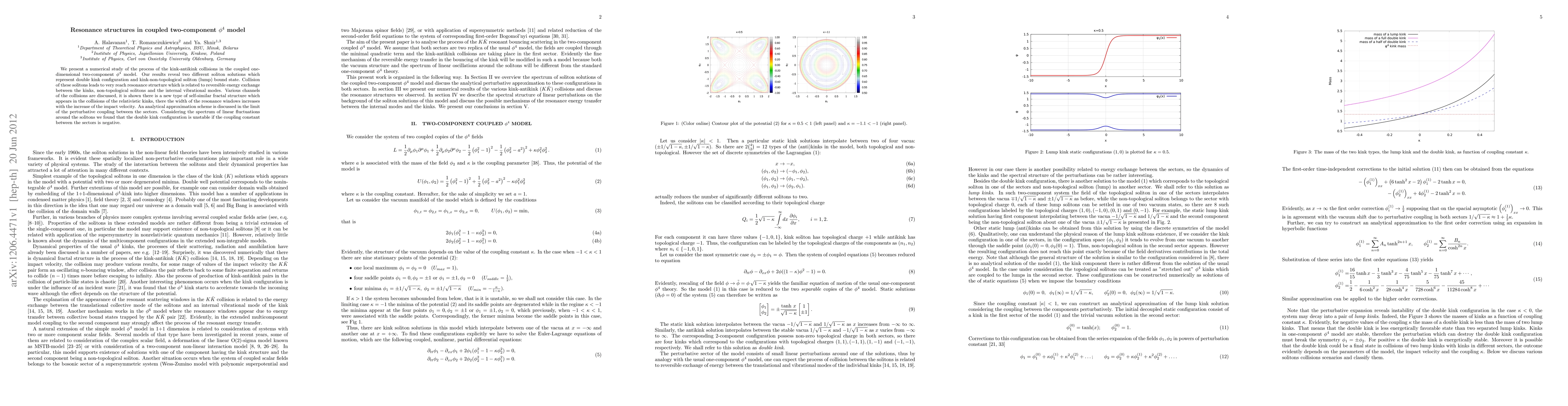 This study numerically investigates kink-antikink collisions in the coupled one-dimensional two-component $\phi^4$ model, revealing two soliton solutions and a complex resonance structure due to reversible energy exchange between solitons and internal vibrational modes. The research also identifies a new fractal structure in the collisions, with resonance widths increasing with impact velocity.