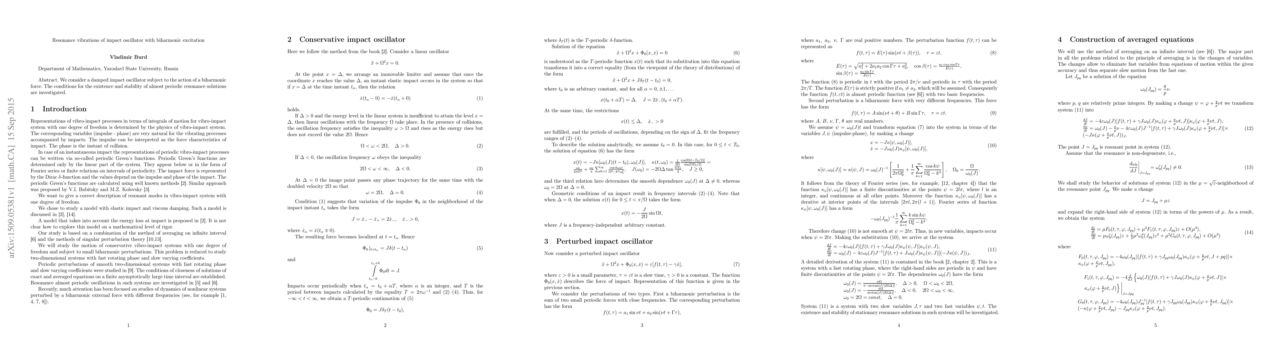 Summary: This paper investigates the resonance vibration of a damped impact oscillator under biharmonic excitation, focusing on the conditions for the existence and stability of almost periodic resonance solutions. The study aims to understand the dynamics and stability of such complex oscillatory systems.