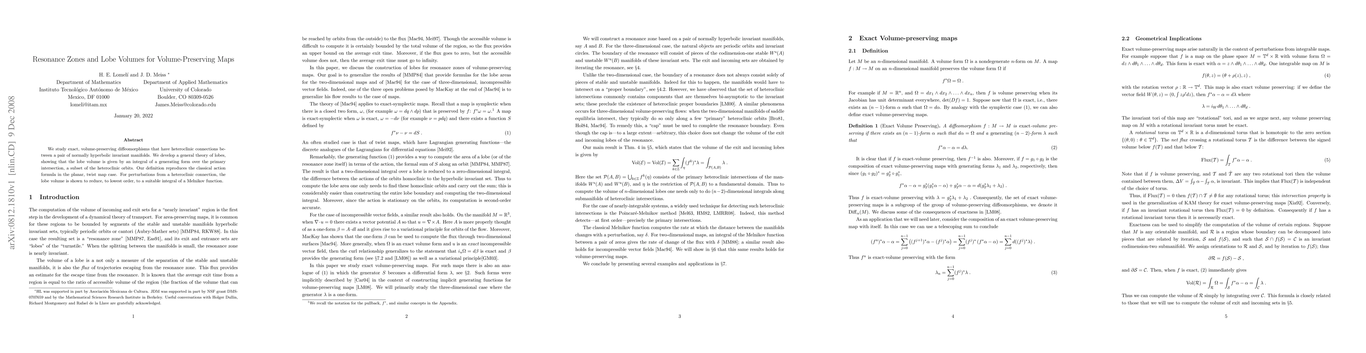 This paper develops a theory for volume-preserving maps with heteroclinic connections, showing that lobe volumes are integrals of a generating form over primary intersections. It also demonstrates that perturbed lobe volumes reduce to integrals of a Melnikov function to the lowest order.