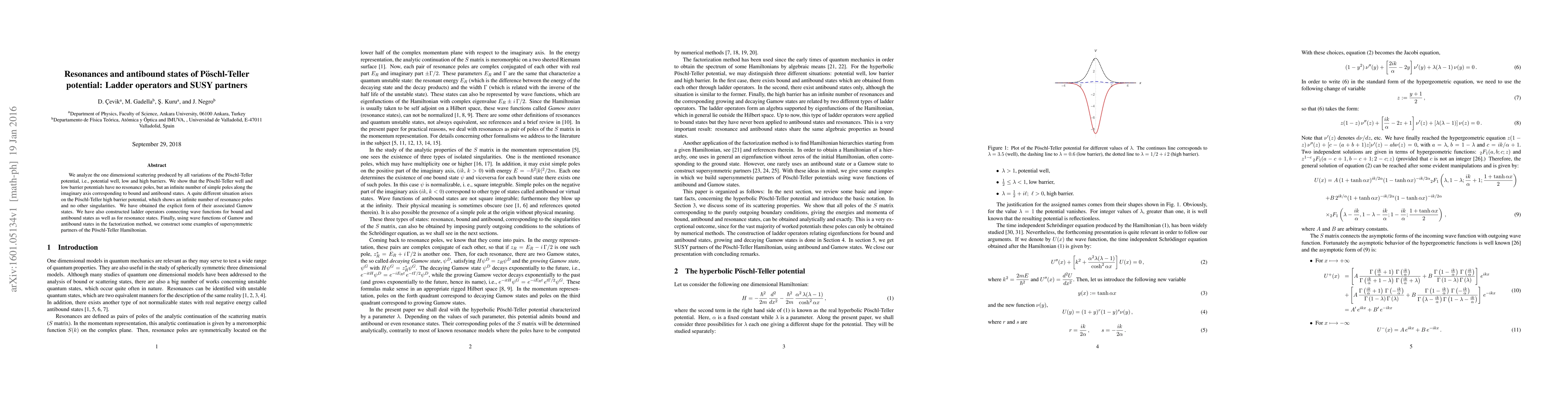 We analyze the one dimensional scattering produced by all variations of the P\"oschl-Teller potential, i.e., potential well, low and high barriers. We show that the P\"oschl-Teller well and low barrier potentials have no resonance poles, but an infinite number of simple poles along the imaginary axis corresponding to bound and antibound states. A quite different situation arises on the P\"oschl-Teller high barrier potential, which shows an infinite number of resonance poles and no other singularities. We have obtained the explicit form of their associated Gamow states. We have also constructed ladder operators connecting wave functions for bound and antibound states as well as for resonance states. Finally, using wave functions of Gamow and antibound states in the factorization method, we construct some examples of supersymmetric partners of the P\"oschl-Teller Hamiltonian.