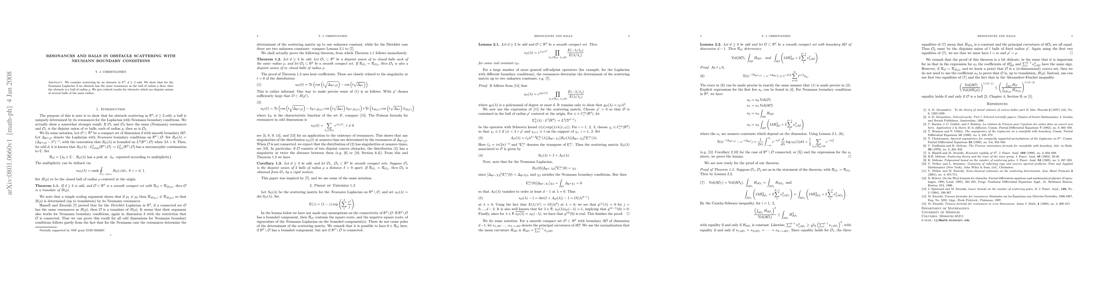 This paper demonstrates that for an obstacle in $\Real^d$ ($d\geq 3$ odd) with the Neumann Laplacian, if it shares the same resonances as a ball of radius $\rho$, then it must be a ball of that radius. It also extends these findings to obstacles composed of disjoint unions of several balls of identical radius.