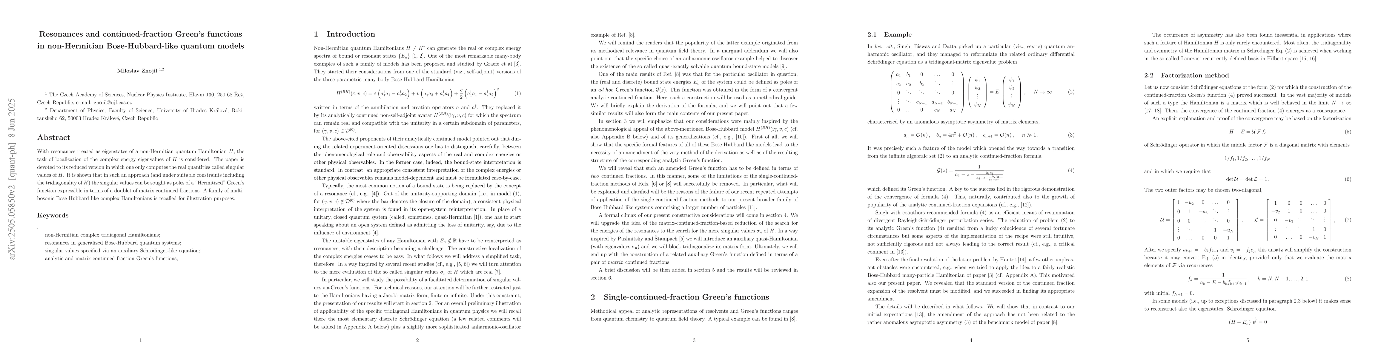 With resonances treated as eigenstates of a non-Hermitian quantum Hamiltonian, the task of localization of the complex energy eigenvalues is considered. The paper is devoted to the reduced version of this task in which one only computes the real quantities called singular values. It is shown that in such an approach (and under suitable constraints including the tridiagonality of the Hamiltdonian) the singular values can be sought as poles of an auxiliary Green's function expressible in terms of a doublet of matrix continued fractions. A family of multi-bosonic Bose-Hubbard-like complex Hamiltonians is recalled for illustration purposes.
