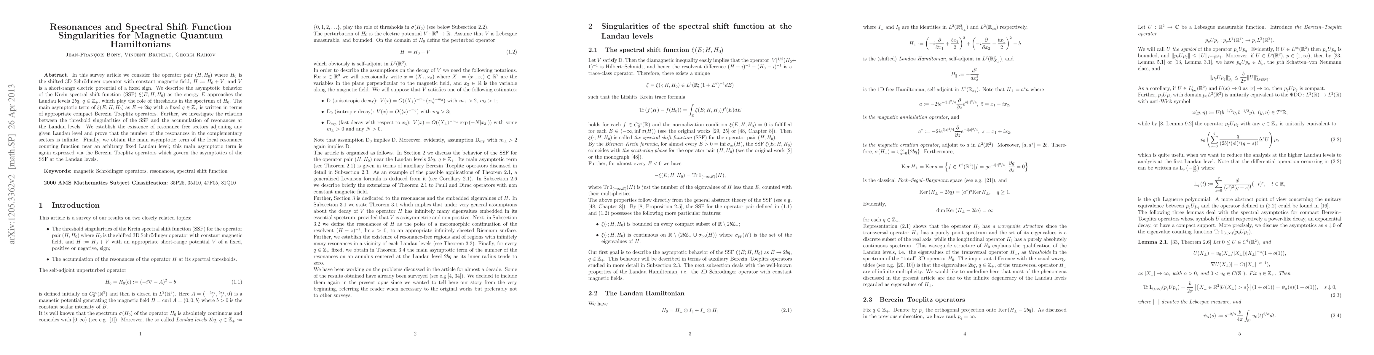 In this survey article we consider the operator pair $(H,H_0)$ where $H_0$ is the shifted 3D Schr\"odinger operator with constant magnetic field, $H : = H_0 + V$, and $V$ is a short-range electric potential of a fixed sign. We describe the asymptotic behavior of the Krein spectral shift function (SSF) $\xi(E; H,H_0)$ as the energy $E$ approaches the Landau levels $2bq$, $q \in {\mathbb Z}_+$, which play the role of thresholds in the spectrum of $H_0$. The main asymptotic term of $\xi(E; H,H_0)$ as $E \to 2bq$ with a fixed $q \in {\mathbb Z}_+$ is written in the terms of appropriate compact Berezin-Toeplitz operators. Further, we investigate the relation between the threshold singularities of the SSF and the accumulation of resonances at the Landau levels. We establish the existence of resonance free sectors adjoining any given Landau level and prove that the number of the resonances in the complementary sectors is infinite. Finally, we obtain the main asymptotic term of the local resonance counting function near an arbitrary fixed Landau level; this main asymptotic term is again expressed via the Berezin-Toeplitz operators which govern the asymptotics of the SSF at the Landau levels.
