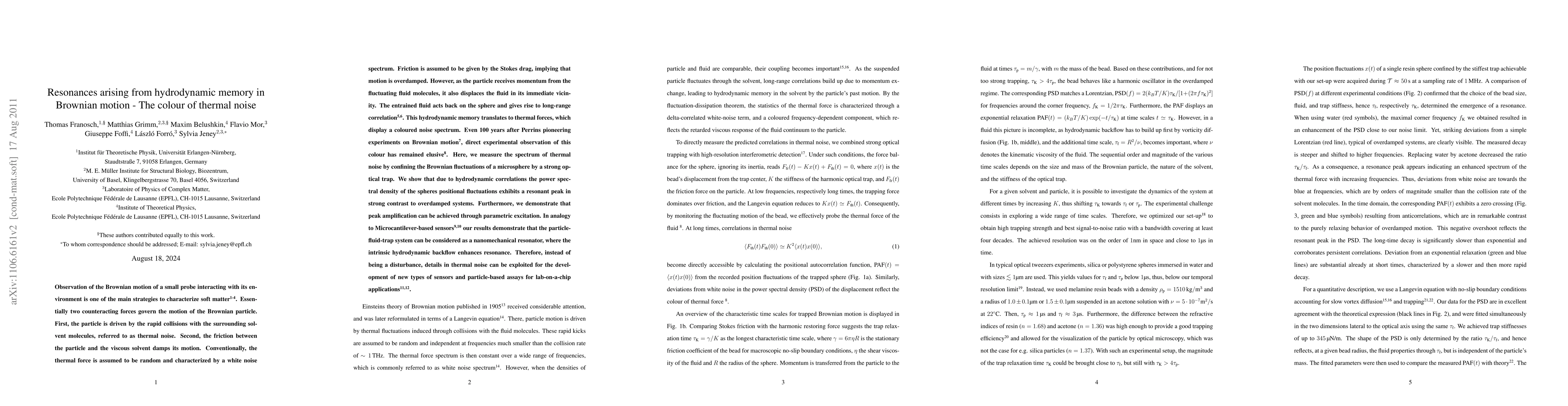 Observation of the Brownian motion of a small probe interacting with its environment is one of the main strategies to characterize soft matter. Essentially two counteracting forces govern the motion of the Brownian particle. First, the particle is driven by the rapid collisions with the surrounding solvent molecules, referred to as thermal noise. Second, the friction between the particle and the viscous solvent damps its motion. Conventionally, the thermal force is assumed to be random and characterized by a white noise spectrum. Friction is assumed to be given by the Stokes drag, implying that motion is overdamped. However, as the particle receives momentum from the fluctuating fluid molecules, it also displaces the fluid in its immediate vicinity. The entrained fluid acts back on the sphere and gives rise to long-range correlation. This hydrodynamic memory translates to thermal forces, which display a coloured noise spectrum. Even 100 years after Perrin's pioneering experiments on Brownian motion, direct experimental observation of this colour has remained elusive. Here, we measure the spectrum of thermal noise by confining the Brownian fluctuations of a microsphere by a strong optical trap. We show that due to hydrodynamic correlations the power spectral density of the spheres positional fluctuations exhibits a resonant peak in strong contrast to overdamped systems. Furthermore, we demonstrate that peak amplification can be achieved through parametric excitation. In analogy to Microcantilever-based sensors our results demonstrate that the particle-fluid-trap system can be considered as a nanomechanical resonator, where the intrinsic hydrodynamic backflow enhances resonance. Therefore, instead of being a disturbance, details in thermal noise can be exploited for the development of new types of sensors and particle-based assays for lab-on-a-chip applications.