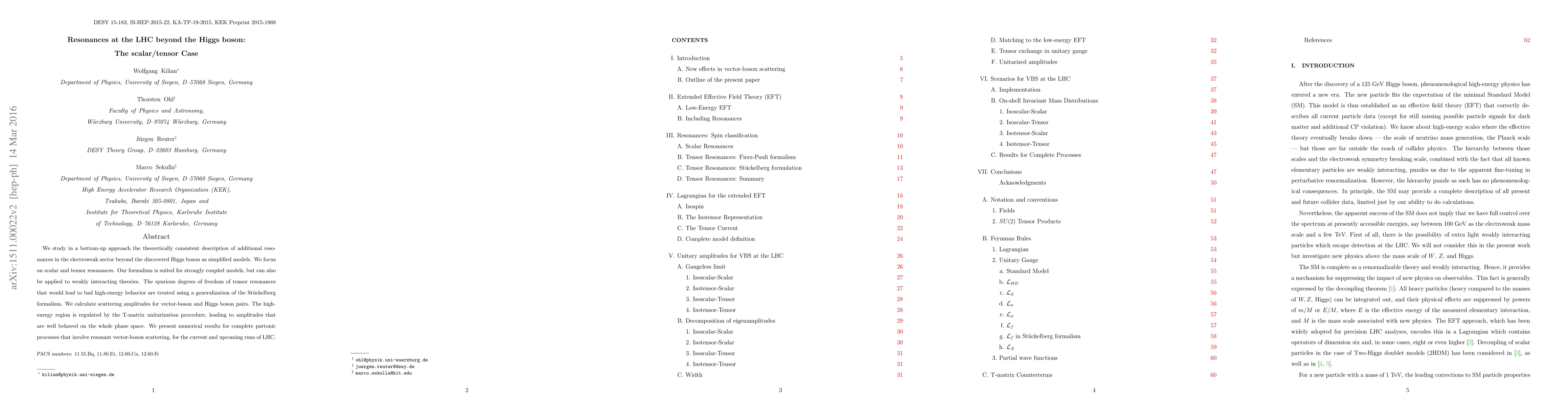 We study in a bottom-up approach the theoretically consistent description of additional resonances in the electroweak sector beyond the discovered Higgs boson as simplified models. We focus on scalar and tensor resonances. Our formalism is suited for strongly coupled models, but can also be applied to weakly interacting theories. The spurious degrees of freedom of tensor resonances that would lead to bad high-energy behavior are treated using a generalization of the Stuckelberg formalism. We calculate scattering amplitudes for vector-boson and Higgs boson pairs. The high-energy region is regulated by the T-matrix unitarization procedure, leading to amplitudes that are well behaved on the whole phase space. We present numerical results for complete partonic processes that involve resonant vector-boson scattering, for the current and upcoming runs of LHC.