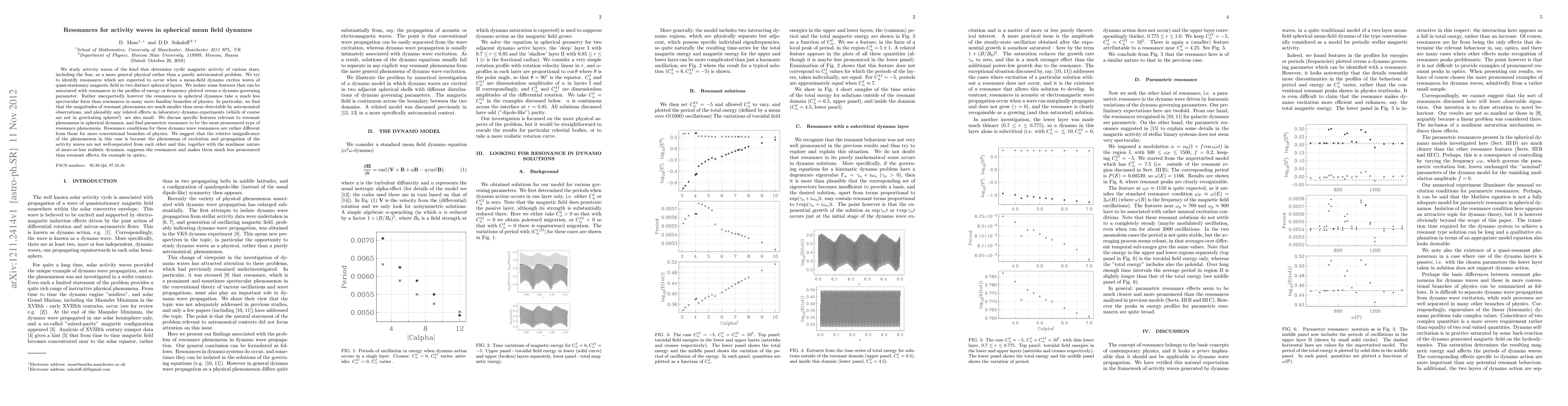 We study activity waves of the kind that determine cyclic magnetic activity of various stars, including the Sun, as a more general physical rather than a purely astronomical problem. We try to identify resonances which are expected to occur when a mean-field dynamo excites waves of quasi-stationary magnetic field in two distinct spherical layers. We isolate some features that can be associated with resonances in the profiles of energy or frequency plotted versus a dynamo governing parameter. Rather unexpectedly however the resonances in spherical dynamos take a much less spectacular form than resonances in many more familiar branches of physics. In particular, we find that the magnitudes of resonant phenomena are much smaller than seem detectable by astronomical observations, and plausibly any related effects in laboratory dynamo experiments (which of course are not in gravitating spheres!) are also small. We discuss specific features relevant to resonant phenomena in spherical dynamos, and find parametric resonance to be the most pronounced type of resonance phenomena. Resonance conditions for these dynamo wave resonances are rather different from those for more conventional branches of physics. We suggest that the relative insignificance of the phenomenon in this case is because the phenomena of excitation and propagation of the activity waves are not well-separated from each other and this, together with the nonlinear nature of more-or-less realistic dynamos, suppress the resonances and makes them much less pronounced than resonant effects, for example in optics.