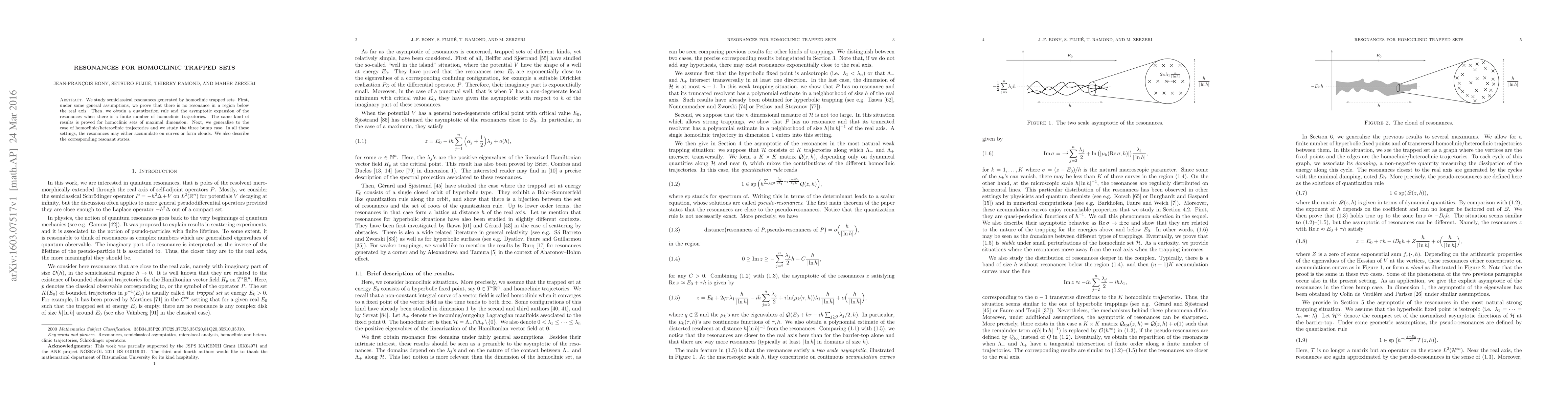 This paper investigates semiclassical resonances associated with homoclinic trapped sets, proving the absence of resonances below the real axis under general assumptions. It derives a quantization rule and asymptotic expansion for finite homoclinic trajectories, extending results to maximal dimension homoclinic sets, and explores homoclinic/heteroclinic scenarios, describing resonant states and their accumulation patterns.