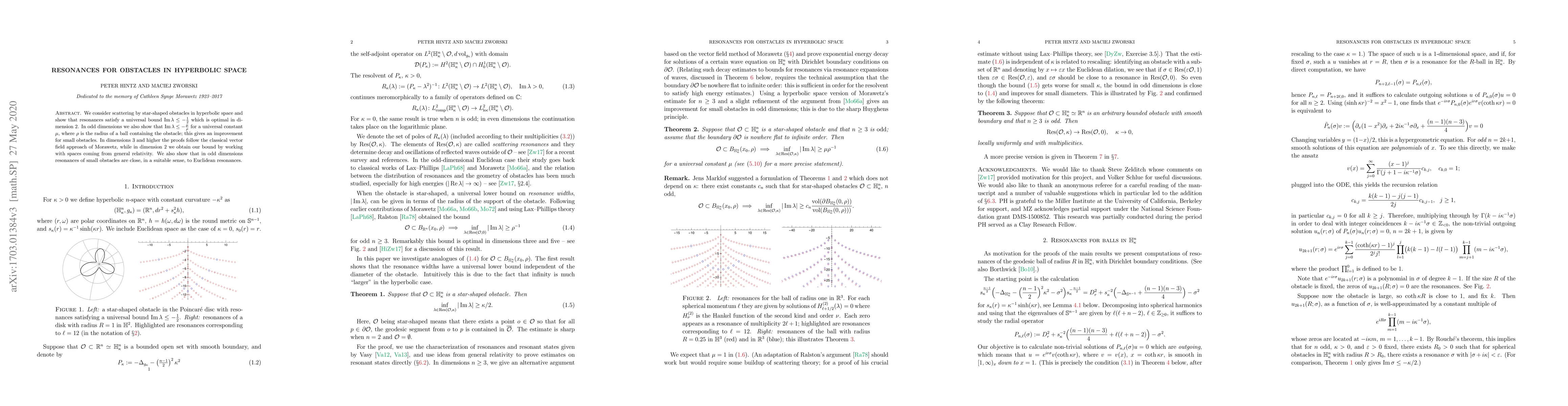 We consider scattering by star-shaped obstacles in hyperbolic space and show that resonances satisfy a universal bound $\mathrm{Im}\,\lambda \leq -\frac{1}{2}$ which is optimal in dimension $2$. In odd dimensions we also show that $\mathrm{Im}\,\lambda \leq -\frac{\mu}{\rho}$ for a universal constant $\mu$, where $\rho$ is the radius of a ball containing the obstacle; this gives an improvement for small obstacles. In dimensions $3$ and higher the proofs follow the classical vector field approach of Morawetz, while in dimension $2$ we obtain our bound by working with spaces coming from general relativity. We also show that in odd dimensions resonances of small obstacles are close, in a suitable sense, to Euclidean resonances.