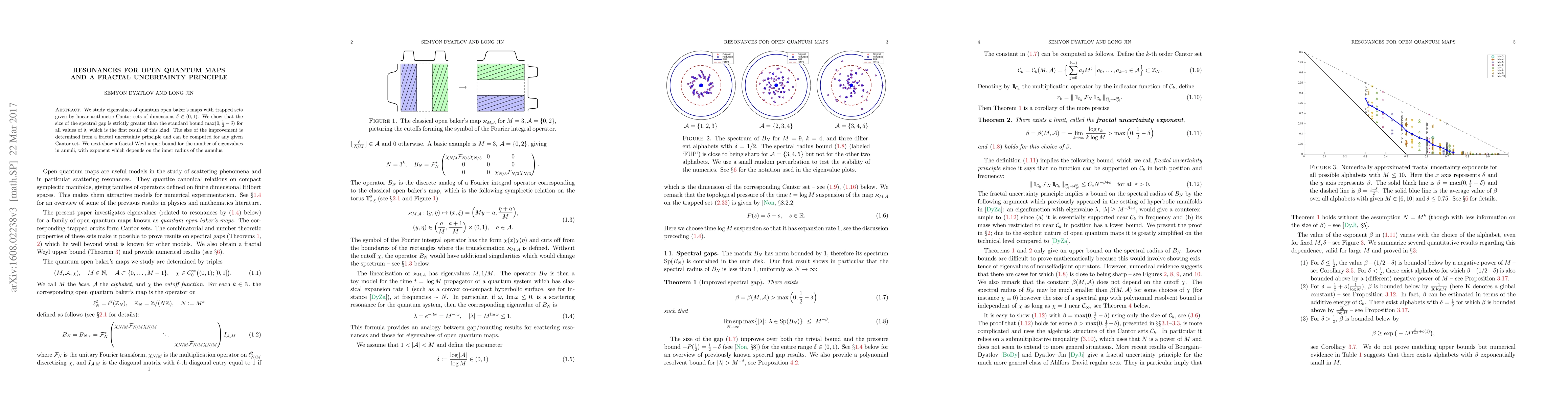 We study eigenvalues of quantum open baker's maps with trapped sets given by linear arithmetic Cantor sets of dimensions $\delta\in (0,1)$. We show that the size of the spectral gap is strictly greater than the standard bound $\max(0,{1\over 2}-\delta)$ for all values of $\delta$, which is the first result of this kind. The size of the improvement is determined from a fractal uncertainty principle and can be computed for any given Cantor set. We next show a fractal Weyl upper bound for the number of eigenvalues in annuli, with exponent which depends on the inner radius of the annulus.