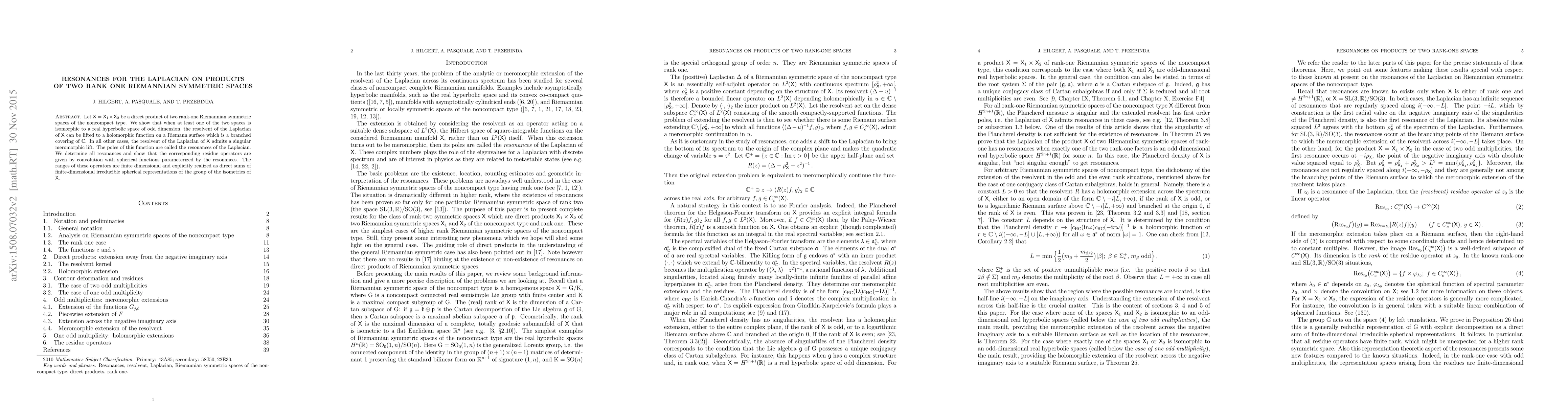 This paper investigates the resonances of the Laplacian on products of two rank-one Riemannian symmetric spaces, showing that when at least one space is a real hyperbolic space of odd dimension, the resolvent lifts to a holomorphic function on a branched covering of the complex plane. In other cases, the resolvent admits a singular meromorphic lift, with the poles termed resonances, whose residue operators are convolutions with spherical functions.