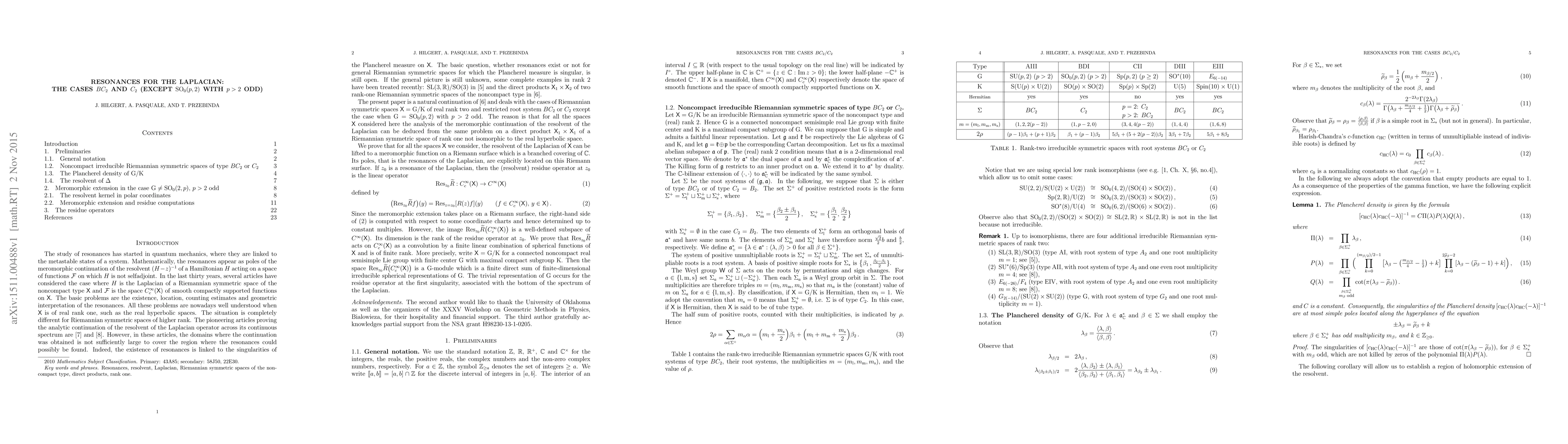 Let $X=G/K$ be a Riemannian symmetric space of the noncompact type and restricted root system $BC_2$ or $C_2$ (except $G=SO_0(p,2)$ with $p>2$ odd). The analysis of the meromorphic continuation of the resolvent of the Laplacian of $X$ is reduced from the analysis of the same problem for a direct product of two isomorphic rank-one Riemannian symmetric spaces of the noncompact type which are not isomorphic to real hyperbolic spaces. We prove that the resolvent of the Laplacian of $X$ can be lifted to a meromorphic function on a Riemann surface which is a branched covering of the complex plane. Its poles, that is the resonances of the Laplacian, are explicitly located on this Riemann surface. The residue operators at the resonances have finite rank. Their images are finite direct sums of finite-dimensional irreducible spherical representations of $G$.
