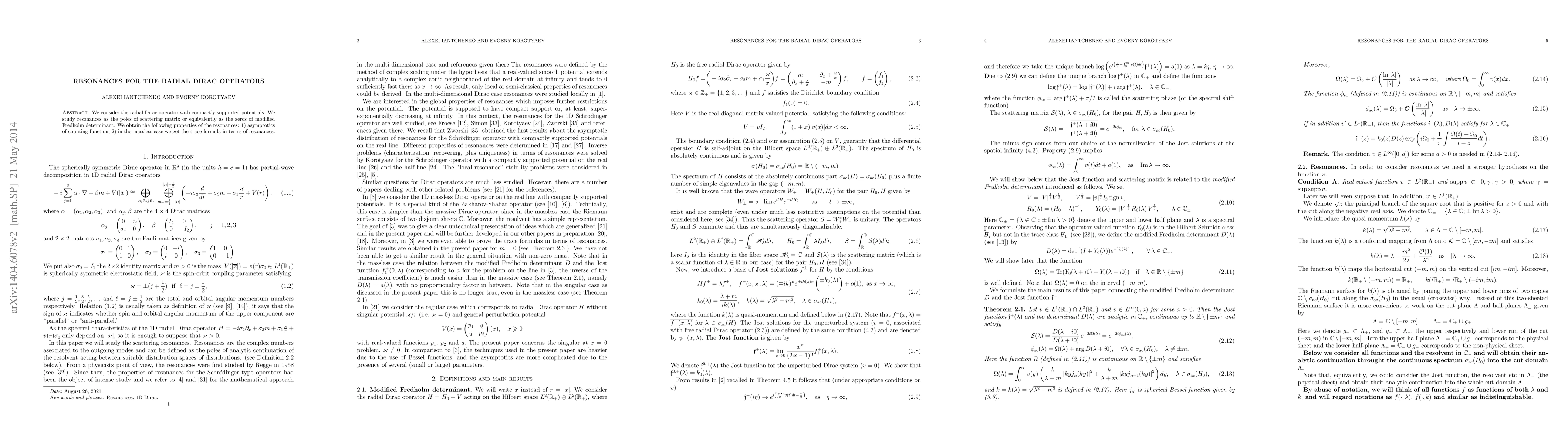 This paper investigates the resonances of radial Dirac operators with compactly supported potentials, identifying them as poles of the scattering matrix or zeros of the modified Fredholm determinant. It derives the asymptotic behavior of the counting function for resonances and provides a trace formula in terms of resonances for the massless case.