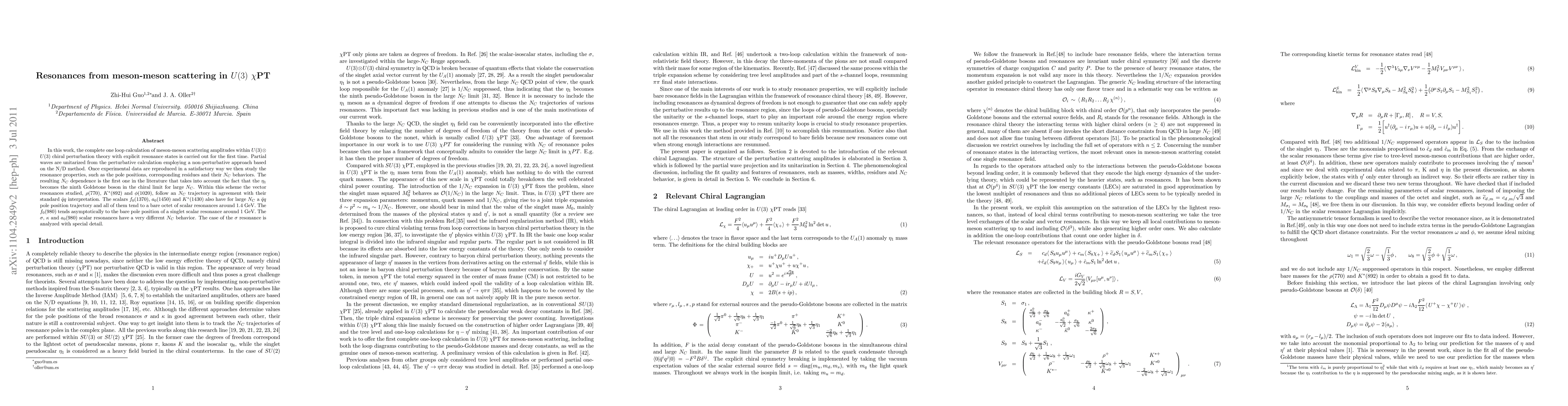 In this work, the complete one loop calculation of meson-meson scattering amplitudes within U(3)\otimes U(3) chiral perturbation theory with explicit resonance states is carried out for the first time. Partial waves are unitarized from the perturbative calculation employing a non-perturbative approach based on the N/D method. Once experimental data are reproduced in a satisfactory way we then study the resonance properties, such as the pole positions, corresponding residues and their N_C behaviors. The resulting N_C dependence is the first one in the literature that takes into account the fact that the \eta_1 becomes the ninth Goldstone boson in the chiral limit for large N_C. Within this scheme the vector resonances studied, \rho(770), K^*(892) and \phi(1020), follow an N_C trajectory in agreement with their standard \bar{q}q interpretation. The scalars f_0(1370), a_0(1450) and K^*(1430) also have for large N_C a \bar{q}q pole position trajectory and all of them tend to a bare octet of scalar resonances around 1.4 GeV. The f_0(980) tends asymptotically to the bare pole position of a singlet scalar resonance around 1 GeV. The \sigma, \kappa and a_0(980) scalar resonances have a very different N_C behavior. The case of the \sigma resonance is analyzed with special detail.