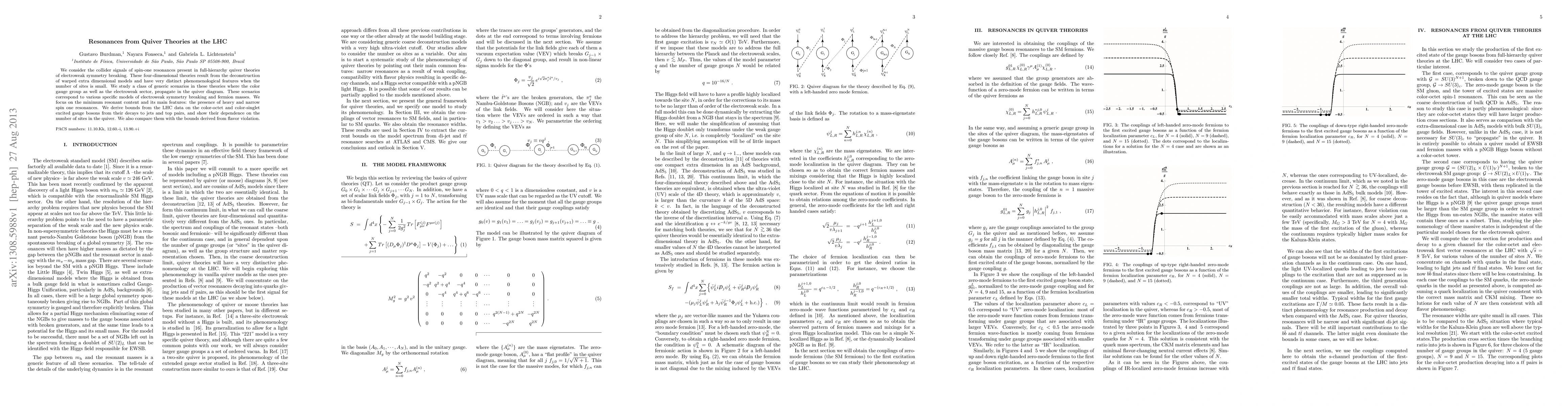 We consider the collider signals of spin-one resonances present in full-hierarchy quiver theories of electroweak symmetry breaking. These four-dimensional theories result from the deconstruction of warped extra dimensional models and have very distinct phenomenological features when the number of sites is small. We study a class of generic scenarios in these theories where the color gauge group as well as the electroweak sector, propagate in the quiver diagram. These scenarios correspond to various specific models of electroweak symmetry breaking and fermion masses. We focus on the minimum resonant content and its main features: the presence of heavy and narrow spin one resonances. We derive bounds from the LHC data on the color-octet and color-singlet excited gauge bosons from their decays to jets and top pairs, and show their dependence on the number of sites in the quiver. We also compare them with the bounds derived from flavor violation.