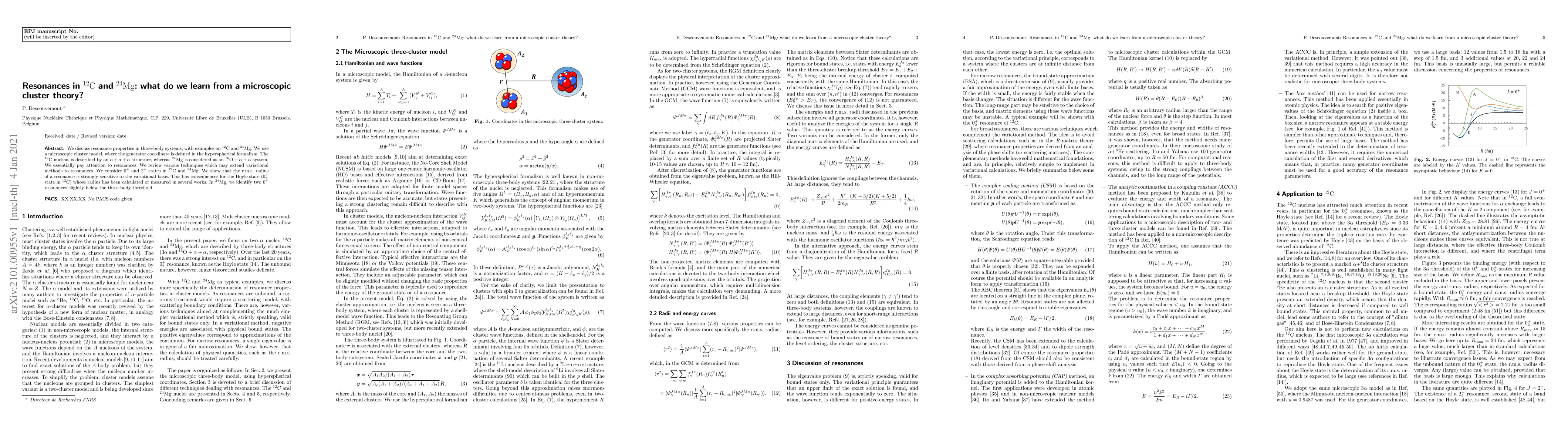We discuss resonance properties in three-body systems, with examples on $^{12}{\rm C}$ and $^{24}{\rm Mg}$. We use a microscopic cluster model, where the generator coordinate is defined in the hyperspherical formalism. The $^{12}{\rm C}$ nucleus is described by an $\alpha+\alpha+\alpha$ structure, whereas $^{24}{\rm Mg}$ is considered as an $^{16}{\rm O}+\alpha+\alpha$ system. We essentially pay attention to resonances. We review various techniques which may extend variational methods to resonances. We consider $0^+$ and $2^+$ states in $^{12}{\rm C}$ and $^{24}{\rm Mg}$. We show that the r.m.s. radius of a resonance is strongly sensitive to the variational basis. This has consequences for the Hoyle state ($0^+_2$ state in $^{12}{\rm C}$) whose radius has been calculated or measured in several works. In $^{24}{\rm Mg}$, we identify two $0^+$ resonances slightly below the three-body threshold.