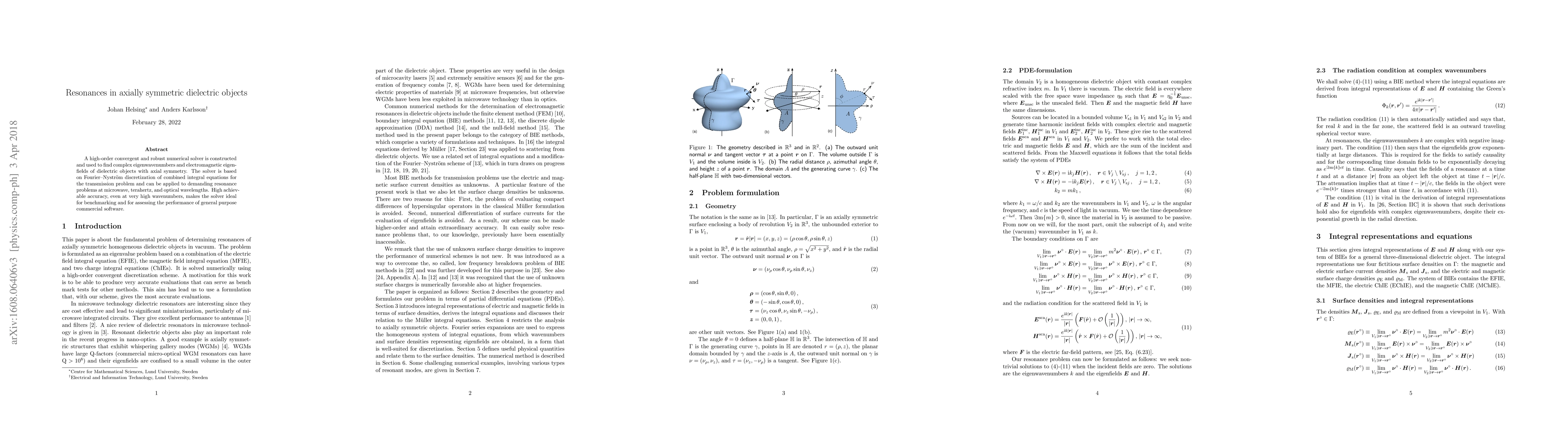 A high-order convergent and robust numerical solver is constructed and used to find complex eigenwavenumbers and electromagnetic eigenfields of dielectric objects with axial symmetry. The solver is based on Fourier--Nystr\"om discretization of combined integral equations for the transmission problem and can be applied to demanding resonance problems at microwave, terahertz, and optical wavelengths. High achievable accuracy, even at very high wavenumbers, makes the solver ideal for benchmarking and for assessing the performance of general purpose commercial software.