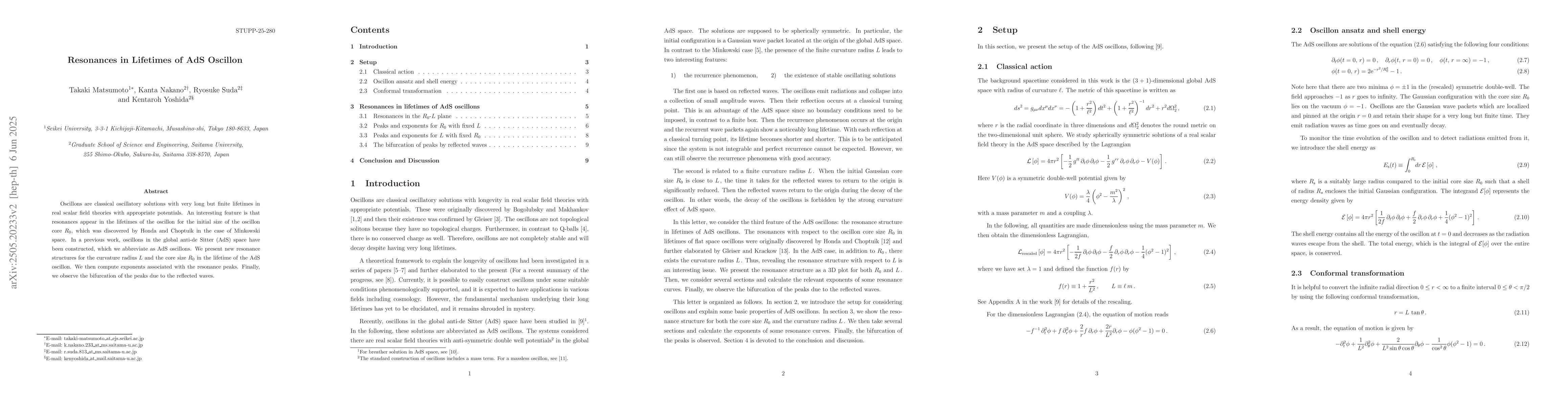 The research constructs AdS oscillons and identifies resonance structures in their lifetimes concerning curvature radius L and core size R0, computing associated exponents and observing peak bifurcation due to reflected waves.