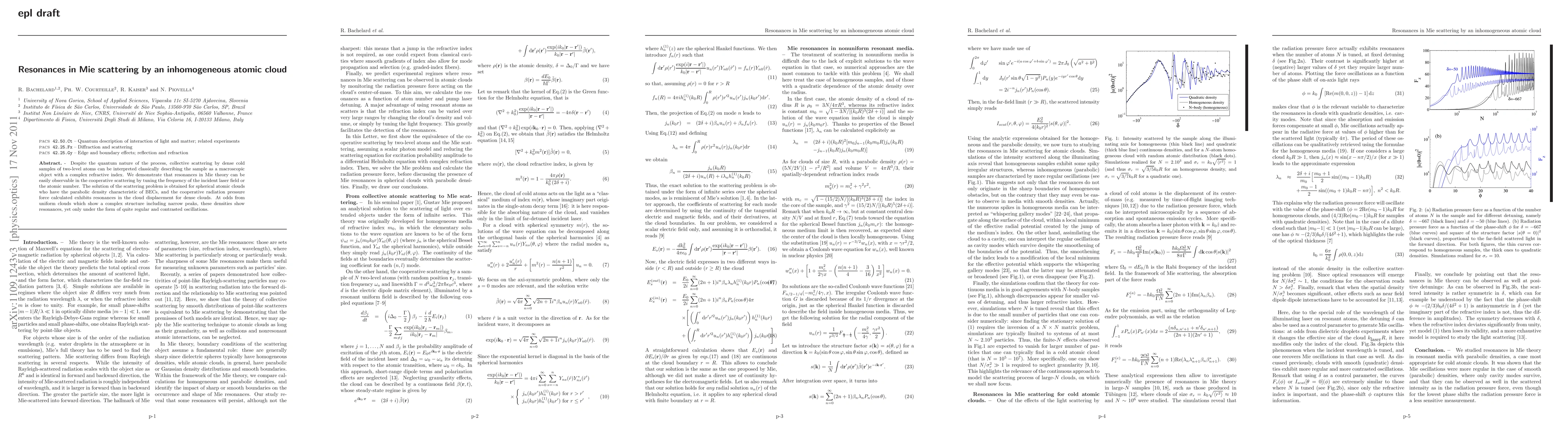 This paper demonstrates that resonances in Mie scattering by dense, cold atomic clouds can be observed by tuning the laser frequency or atomic number, revealing regular and contrasted oscillations in cloud displacement, unlike the complex structure seen in uniform clouds. The study uses classical interpretation of quantum scattering to describe the scattering behavior.