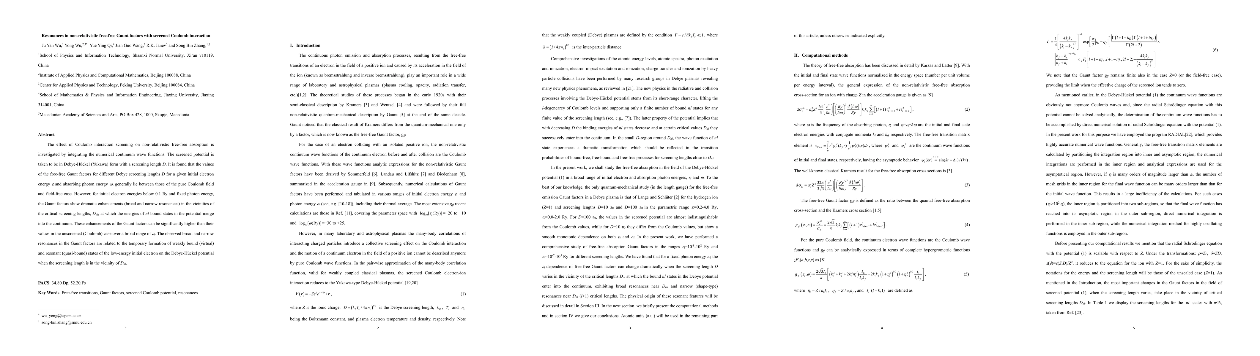 This paper investigates the impact of Coulomb interaction screening on non-relativistic free-free absorption, revealing that Gaunt factors exhibit dramatic enhancements (broad and narrow resonances) near critical screening lengths where bound state energies merge into the continuum. These resonances are linked to the formation of temporary virtual and quasi-bound states due to the screened potential.