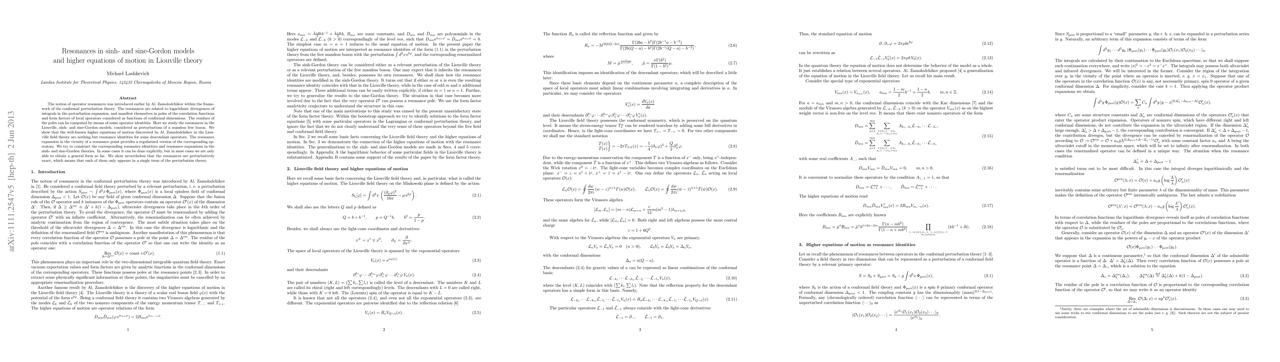 This paper explores operator resonances in Liouville, sinh-Gordon, and sine-Gordon models, revealing that higher equations of motion in Liouville theory correspond to resonance identities. The study shows that resonances are perturbatively exact and provides a regularized version of operators via resonance expansions.