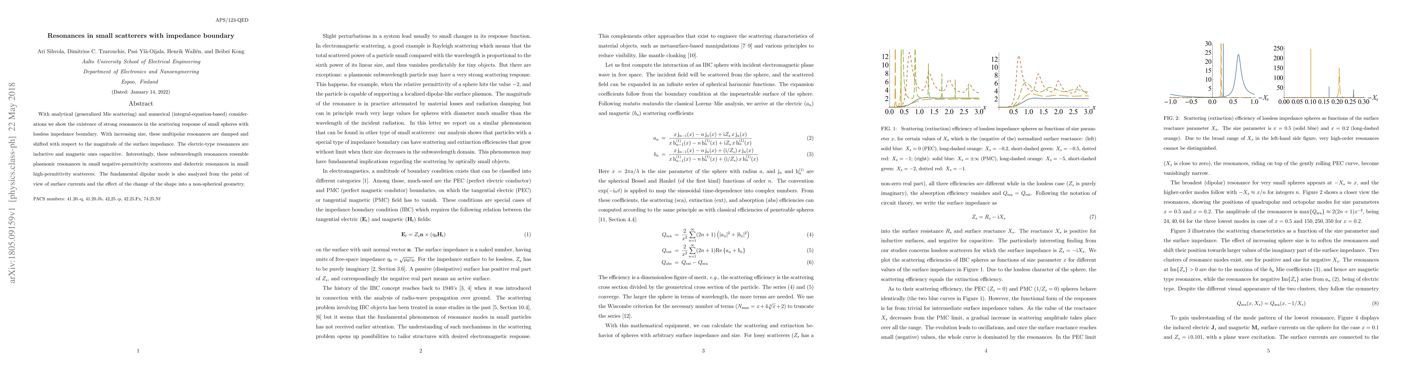 With analytical (generalized Mie scattering) and numerical (integral-equation-based) considerations we show the existence of strong resonances in the scattering response of small spheres with lossless impedance boundary. With increasing size, these multipolar resonances are damped and shifted with respect to the magnitude of the surface impedance. The electric-type resonances are inductive and magnetic ones capacitive. Interestingly, these subwavelength resonances resemble plasmonic resonances in small negative-permittivity scatterers and dielectric resonances in small high-permittivity scatterers. The fundamental dipolar mode is also analyzed from the point of view of surface currents and the effect of the change of the shape into a non-spherical geometry.