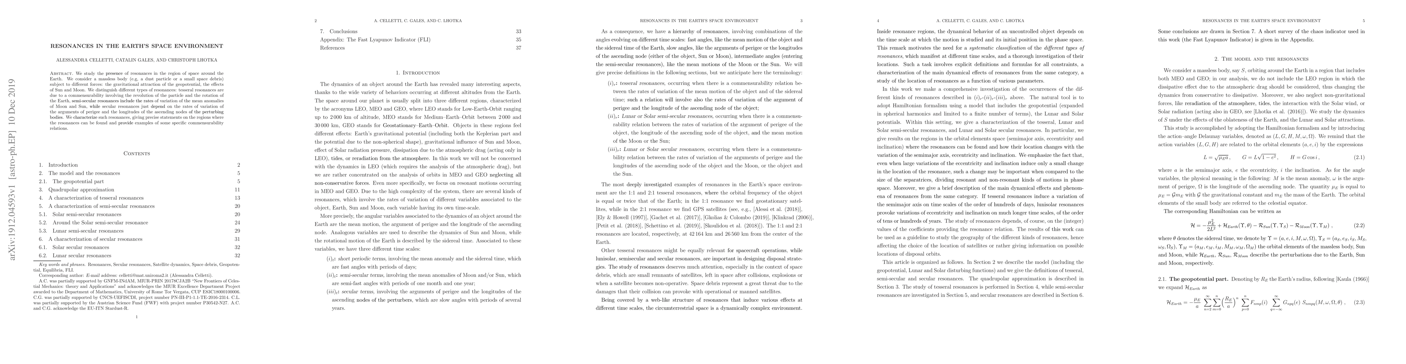 We study the presence of resonances in the region of space around the Earth. We consider a massless body (e.g, a dust particle or a small space debris) subject to different forces: the gravitational attraction of the geopotential, the effects of Sun and Moon. We distinguish different types of resonances: tesseral resonances are due to a commensurability involving the revolution of the particle and the rotation of the Earth, semi-secular resonances include the rates of variation of the mean anomalies of Moon and Sun, while secular resonances just depend on the rates of variation of the arguments of perigee and the longitudes of the ascending nodes of the perturbing bodies. We characterize such resonances, giving precise statements on the regions where the resonances can be found and provide examples of some specific commensurability relations.