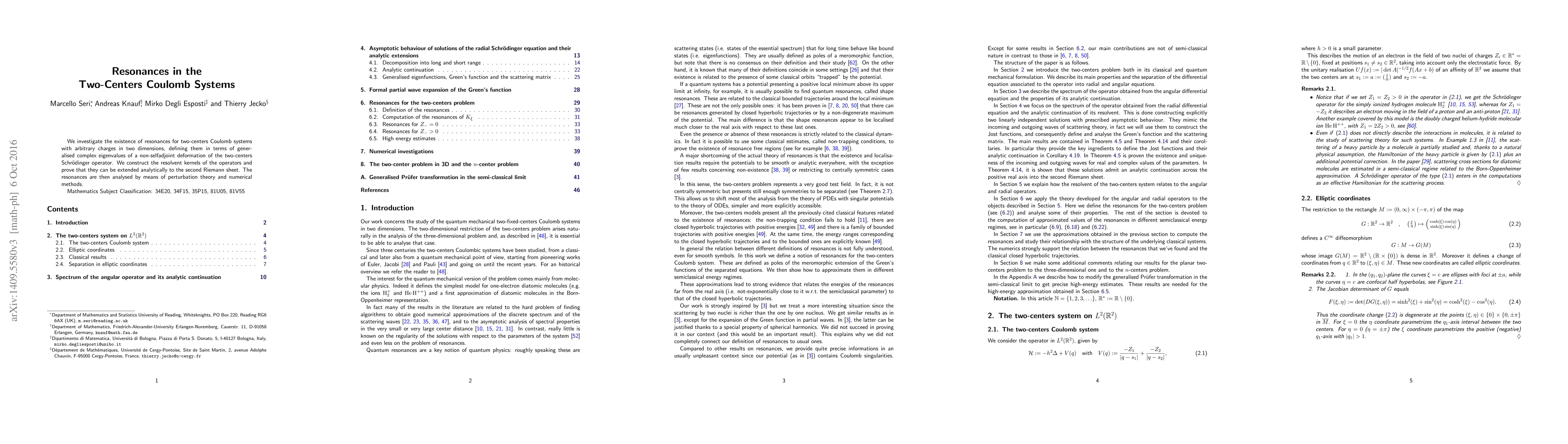 We investigate the existence of resonances for two-centers Coulomb systems with arbitrary charges in two dimensions, defining them in terms of generalised complex eigenvalues of a non-selfadjoint deformation of the two-centers Schr\"odinger operator. We construct the resolvent kernels of the operators and prove that they can be extended analytically to the second Riemann sheet. The resonances are then analysed by means of perturbation theory and numerical methods.