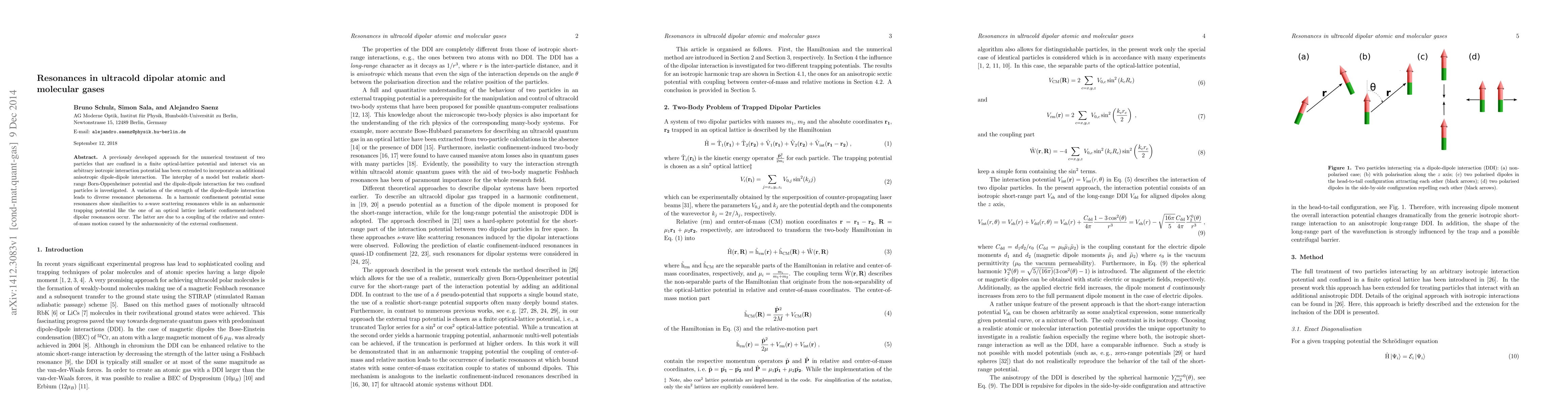 A previously developed approach for the numerical treatment of two particles that are confined in a finite optical-lattice potential and interact via an arbitrary isotropic interaction potential has been extended to incorporate an additional anisotropic dipole-dipole interaction. The interplay of a model but realistic short-range Born-Oppenheimer potential and the dipole-dipole interaction for two confined particles is investigated. A variation of the strength of the dipole-dipole interaction leads to diverse resonance phenomena. In a harmonic confinement potential some resonances show similarities to $s$-wave scattering resonances while in an anharmonic trapping potential like the one of an optical lattice inelastic confinement-induced dipolar resonances occur. The latter are due to a coupling of the relative and center-of-mass motion caused by the anharmonicity of the external confinement.