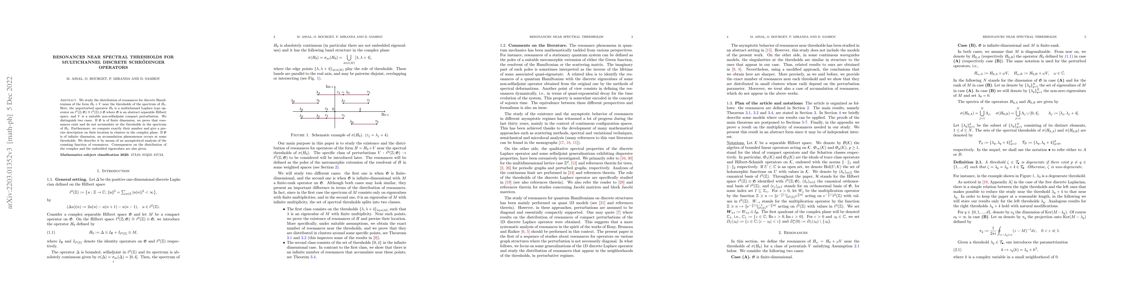 We study the distribution of resonances for discrete Hamiltonians of the form $H_0+V$ near the thresholds of the spectrum of $H_0$. Here, the unperturbed operator $H_0$ is a multichannel Laplace type operator on $\ell^2(\mathbb Z; \mathfrak{G}) \cong \ell^2(\mathbb Z)\otimes \mathfrak{G}$ where ${\mathfrak G}$ is an abstract separable Hilbert space, and $V$ is a suitable non-selfadjoint compact perturbation. We distinguish two cases. If ${\mathfrak G}$ is of finite dimension, we prove that resonances exist and do not accumulate at the thresholds in the spectrum of $H_0$. Furthermore, we compute exactly their number and give a precise description on their location in clusters in the complex plane. If ${\mathfrak G}$ is of infinite dimension, an accumulation phenomenon occurs at some thresholds. We describe it by means of an asymptotical analysis of the counting function of resonances. Consequences on the distribution of the complex and the embedded eigenvalues are also given.