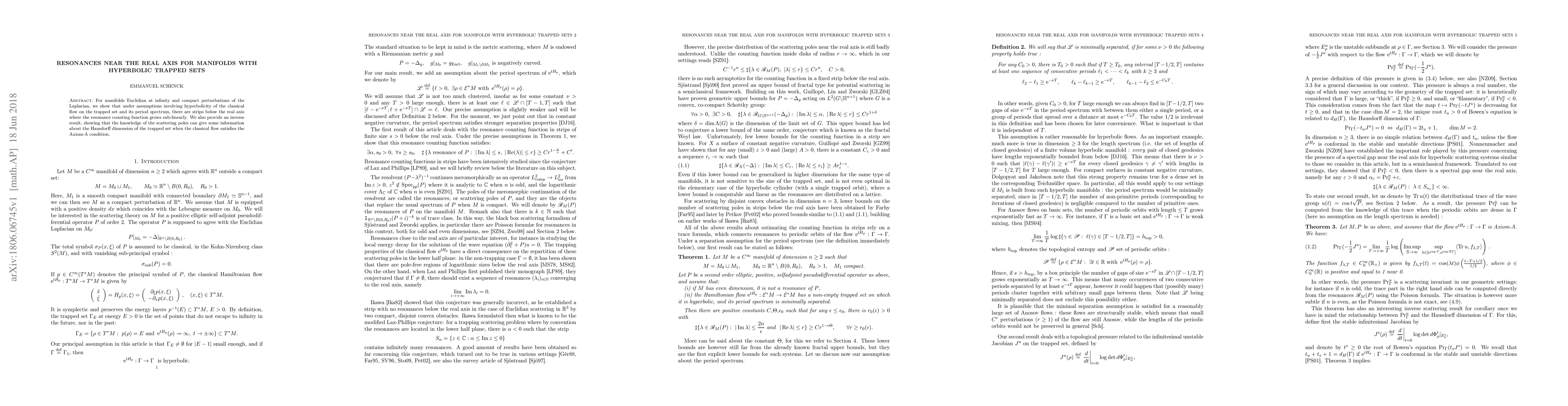 For manifolds Euclidian at infinity and compact perturbations of the Laplacian, we show that under assumptions involving hyperbolicity of the classical flow on the trapped set and its period spectrum, there are strips below the real axis where the resonance counting function grows sub-linearly. We also provide an inverse result, showing that the knowledge of the scattering poles can give some information about the Hausdorff dimension of the trapped set when the classical flow satisfies the Axiom-A condition.