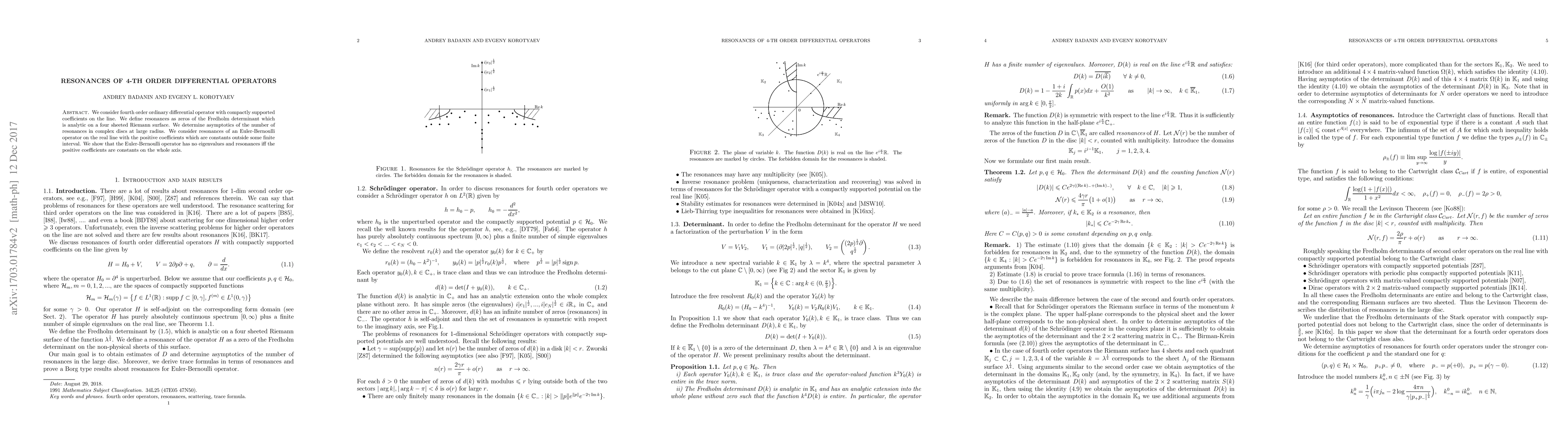 This paper investigates the resonances of fourth-order differential operators with compactly supported coefficients, determining the asymptotic behavior of resonances in complex discs at large radii. It concludes that the Euler-Bernoulli operator has no eigenvalues or resonances if its positive coefficients are constant throughout the entire real line.