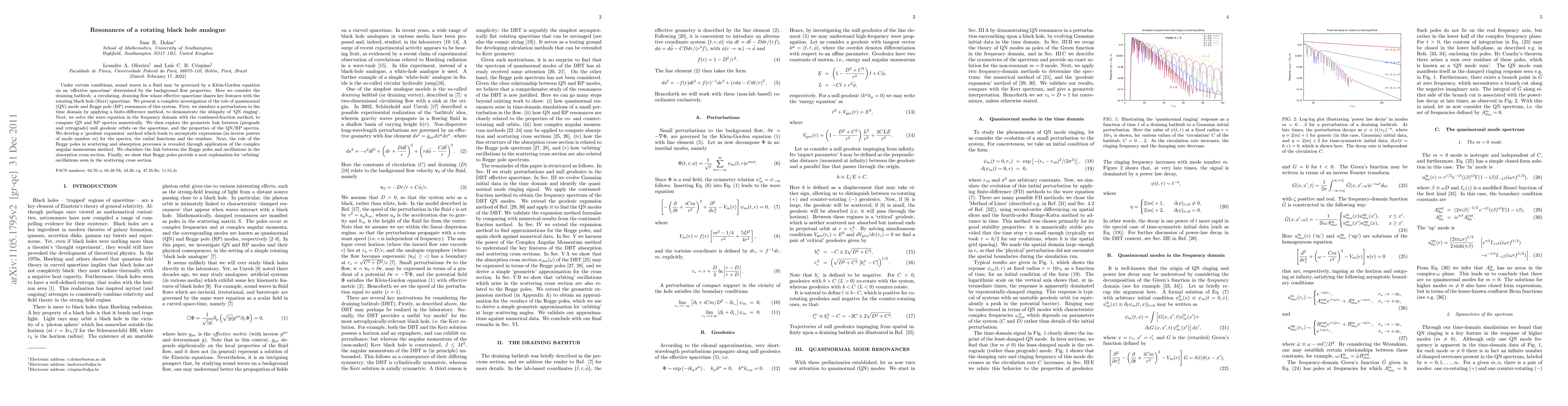Under certain conditions, sound waves in a fluid may be governed by a Klein-Gordon equation on an `effective spacetime' determined by the background flow properties. Here we consider the draining bathtub: a circulating, draining flow whose effective spacetime shares key features with the rotating black hole (Kerr) spacetime. We present a complete investigation of the role of quasinormal (QN) mode and Regge pole (RP) resonances of this system. First, we simulate a perturbation in the time domain by applying a finite-difference method, to demonstrate the ubiquity of `QN ringing'. Next, we solve the wave equation in the frequency domain with the continued-fraction method, to compute QN and RP spectra numerically. We then explore the geometric link between (prograde and retrograde) null geodesic orbits on the spacetime, and the properties of the QN/RP spectra. We develop a `geodesic expansion' method which leads to asymptotic expressions (in inverse powers of mode number $m$) for the spectra, the radial functions and the residues. Next, the role of the Regge poles in scattering and absorption processes is revealed through application of the complex angular momentum method. We elucidate the link between the Regge poles and oscillations in the absorption cross section. Finally, we show that Regge poles provide a neat explanation for `orbiting' oscillations seen in the scattering cross section.