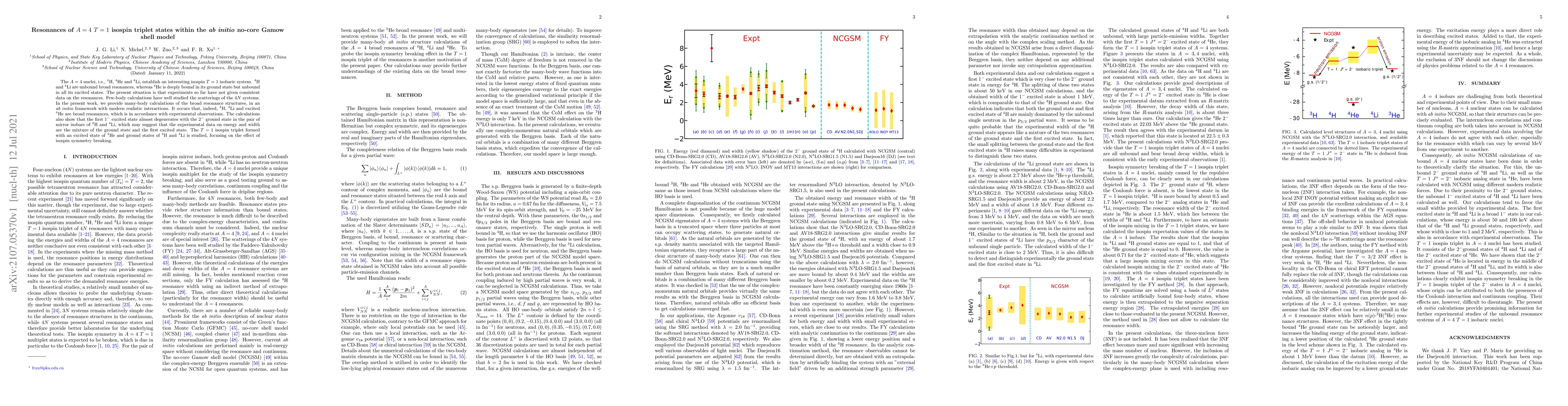 The $A=4$ nuclei, i.e., $^4$H, $^4$He and $^4$Li, establish an interesting isospin $T=1$ isobaric system. $^4$H and $^4$Li are unbound broad resonances, whereas $^4$He is deeply bound in its ground state but unbound in all its excited states. The present situation is that experiments so far have not given consistent data on the resonances. Few-body calculations have well studied the scatterings of the $4N$ systems. In the present work, we provide many-body calculations of the broad resonance structures, in an \textit{ab initio} framework with modern realistic interactions. It occurs that, indeed, $^4$H, $^4$Li and excited $^4$He are broad resonances, which is in accordance with experimental observations. The calculations also show that the first $1^-$ excited state almost degenerates with the $2^-$ ground state in the pair of mirror isobars of $^4$H and $^4$Li, which may suggest that the experimental data on energy and width are the mixture of the ground state and the first excited state. The $T = 1$ isospin triplet formed with an excited state of $^4$He and ground states of $^4$H and $^4$Li is studied, focusing on the effect of isospin symmetry breaking.