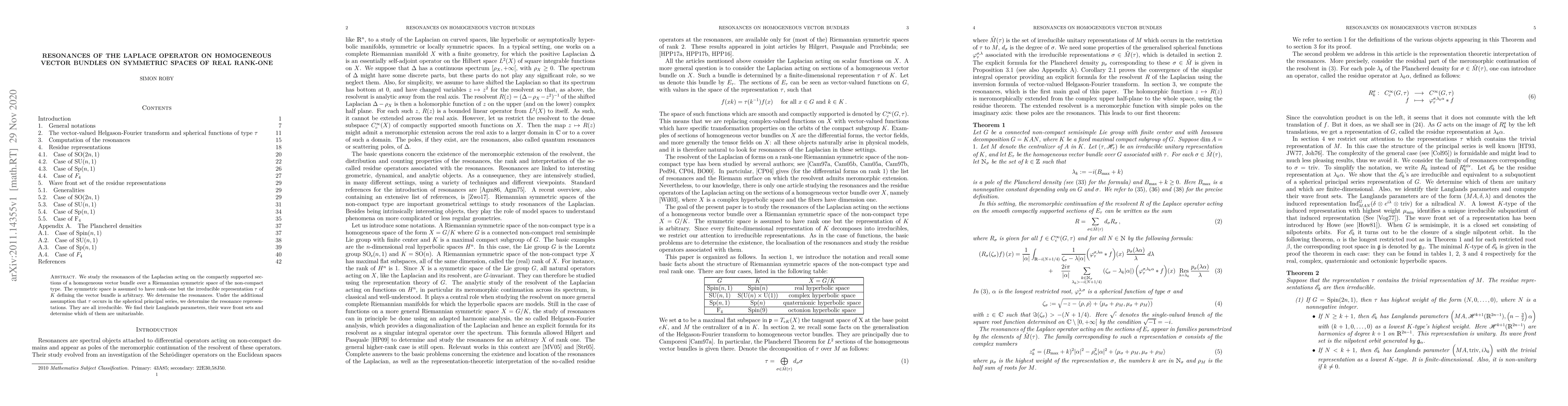 We study the resonances of the Laplacian acting on the compactly supported sections of a homogeneous vector bundle over a Riemannian symmetric space of the non-compact type. The symmetric space is assumed to have rank-one but the irreducible representation $\tau$ of $K$ defining the vector bundle is arbitrary. We determine the resonances. Under the additional assumption that $\tau$ occurs in the spherical principal series, we determine the resonance representations. They are all irreducible. We find their Langlands parameters, their wave front sets and determine which of them are unitarizable.