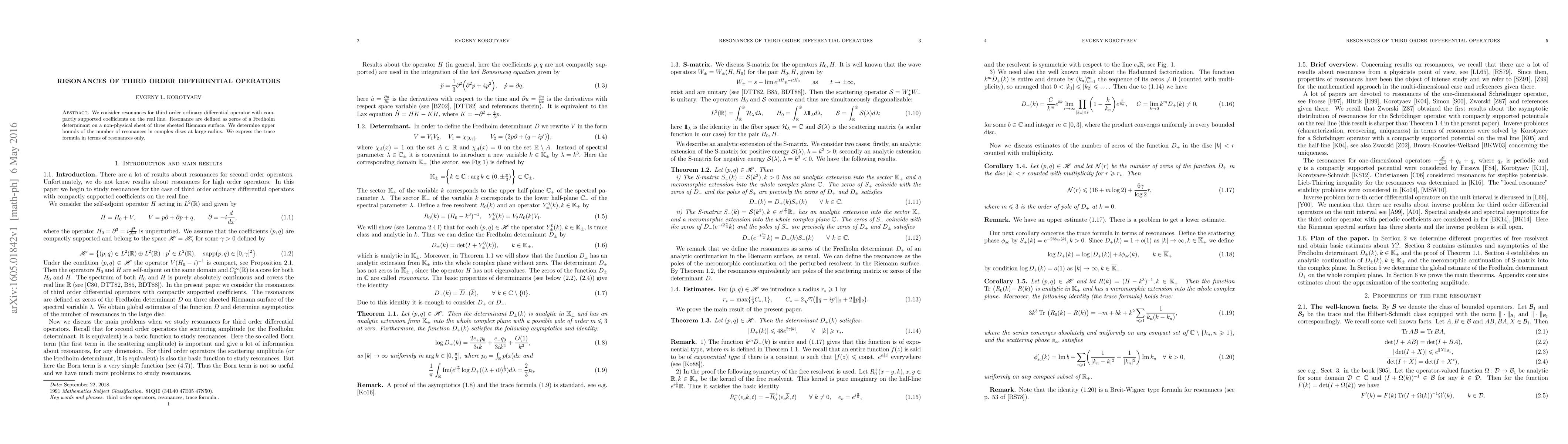 This paper investigates resonances for third-order differential operators with compactly supported coefficients, defining resonances as zeros of a Fredholm determinant on a Riemann surface. The authors determine upper bounds for the number of resonances in complex discs at large radii and express the trace formula solely in terms of these resonances.