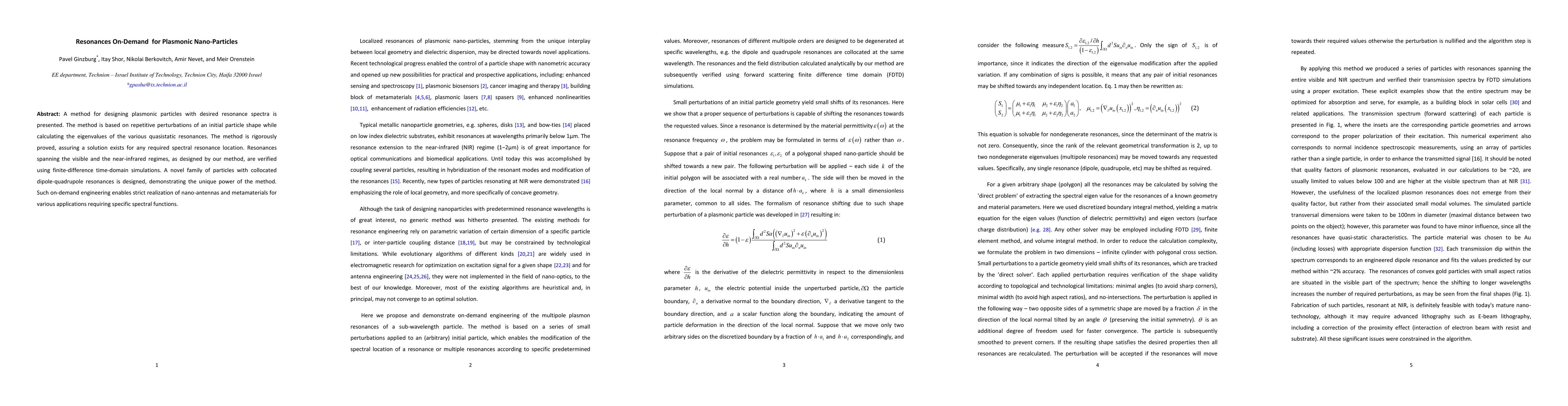 A method for designing plasmonic particles with desired resonance spectra is presented. The method is based on repetitive perturbations of an initial particle shape while calculating the eigenvalues of the various quasistatic resonances. The method is rigorously proved, assuring a solution exists for any required spectral resonance location. Resonances spanning the visible and the near-infrared regimes, as designed by our method, are verified using finite-difference time-domain simulations. A novel family of particles with collocated dipole-quadrupole resonances is designed, demonstrating the unique power of the method. Such on-demand engineering enables strict realization of nano-antennas and metamaterials for various applications requiring specific spectral functions.