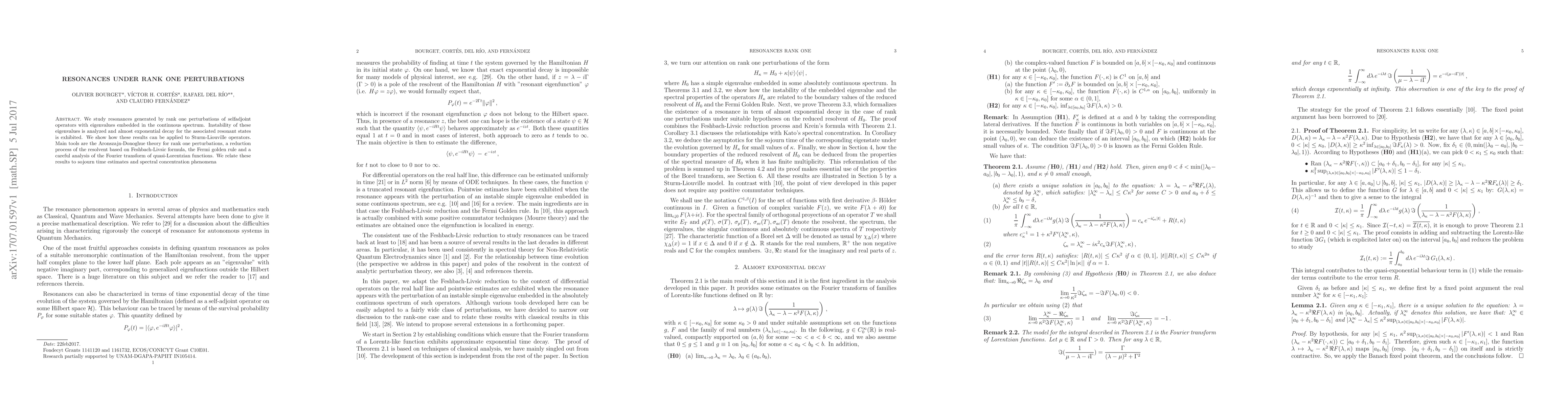 This paper investigates resonances created by rank one perturbations in selfadjoint operators with eigenvalues within the continuous spectrum, focusing on their instability and almost exponential decay. It applies the findings to Sturm-Liouville operators, utilizing Aronszajn-Donoghue theory, Feshbach-Livsic reduction, and Fermi golden rule, and connects these results to sojourn time estimates and spectral concentration.