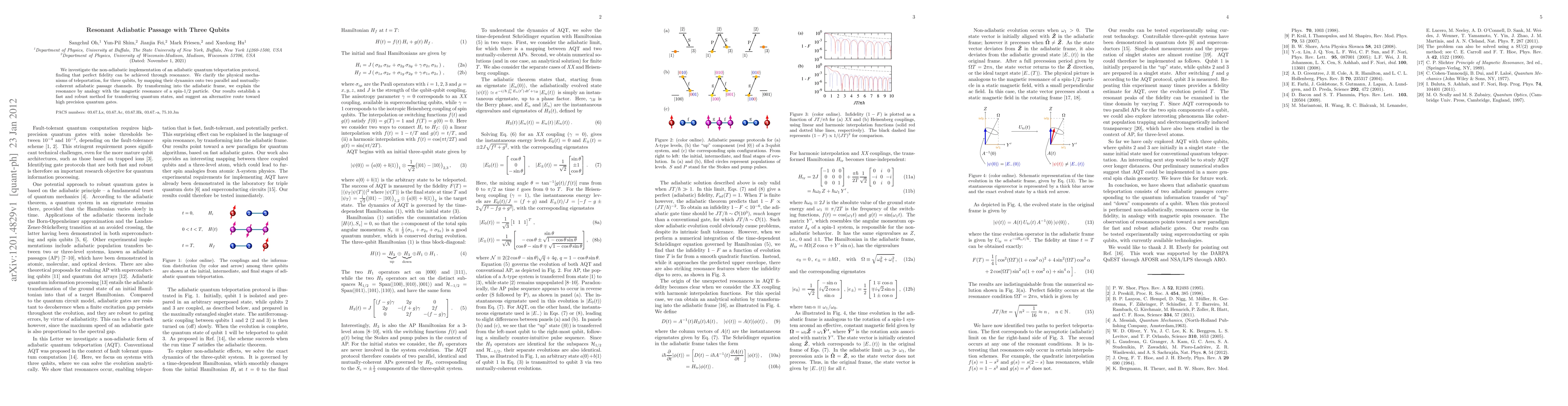 This paper explores a resonant adiabatic passage technique for three-qubit quantum teleportation, demonstrating perfect fidelity through resonance. The study maps the dynamics onto two coherent adiabatic channels, providing a robust method for state transfer and suggesting a pathway for high precision quantum gates.