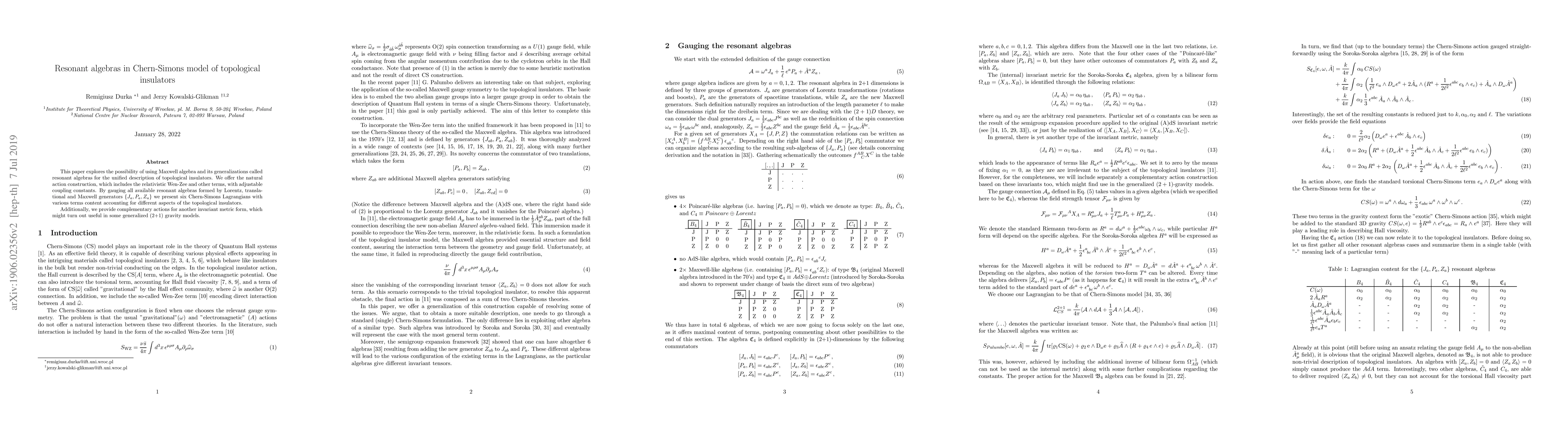 Researchers explore using resonant algebras to unify the description of topological insulators in a Chern-Simons model, proposing six different Lagrangians with varying terms.