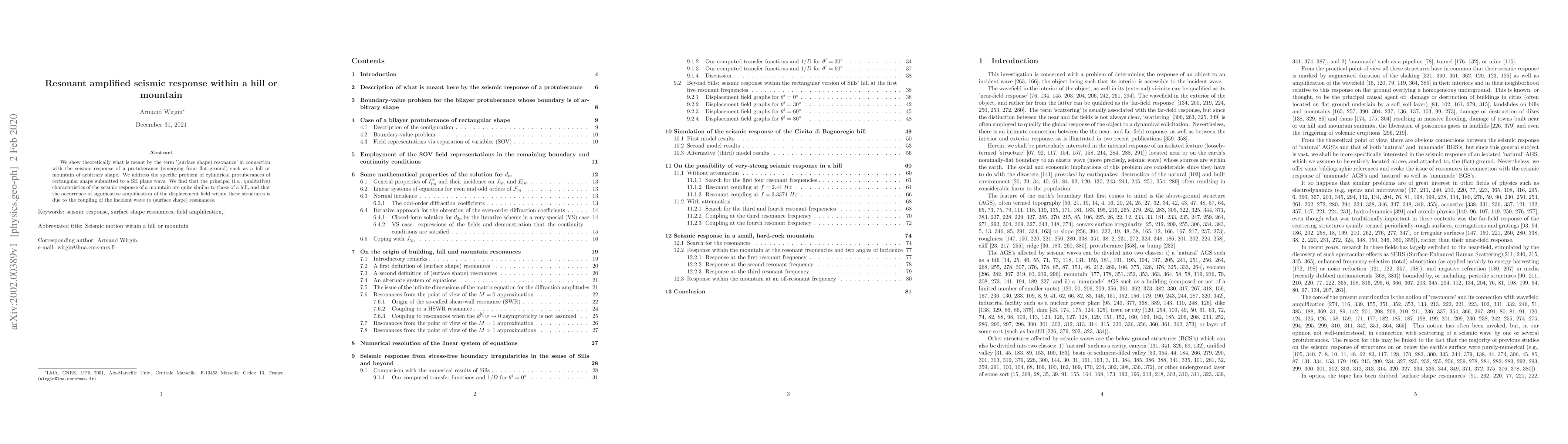 We show theoretically what is meant by the term '(surface shape) resonance' in connection with the seismic response of a protuberance (emerging from flat ground) such as a hill or mountain of arbitrary shape. We address the specific problem of cylindrical protuberances of rectangular shape submitted to a SH plane wave. We find that the principal (i.e., qualitative) characteristics of the seismic response of a mountain are quite similar to those of a hill, and that the occurrence of significative amplification of the displacement field within these structures is due to the coupling of the incident wave to (surface shape) resonances.