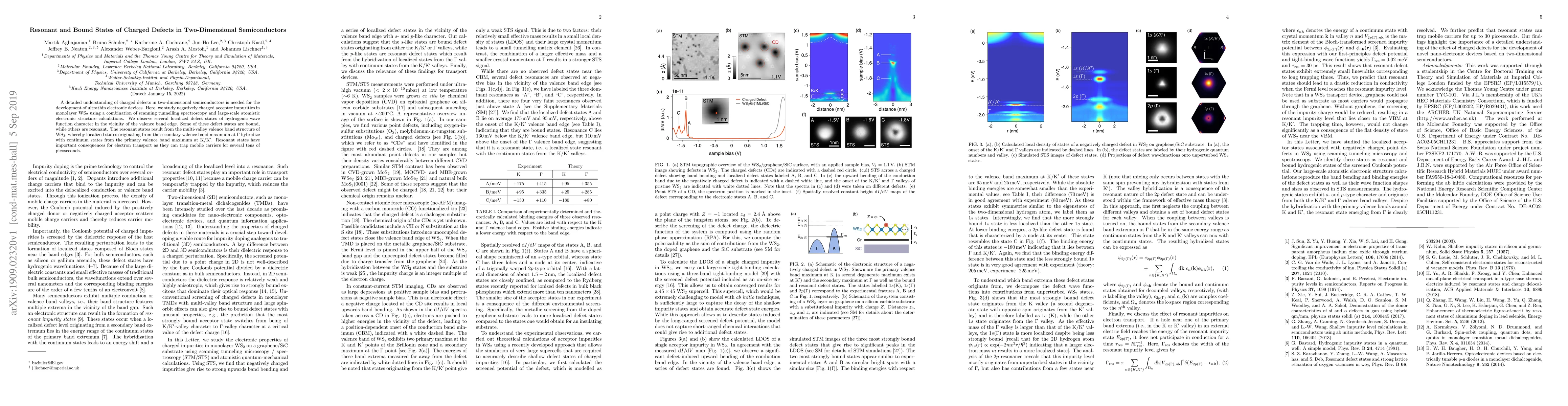 A detailed understanding of charged defects in two-dimensional semiconductors is needed for the development of ultrathin electronic devices. Here, we study negatively charged acceptor impurities in monolayer WS$_2$ using a combination of scanning tunnelling spectroscopy and large-scale atomistic electronic structure calculations. We observe several localized defect states of hydrogenic wave function character in the vicinity of the valence band edge. Some of these defect states are bound, while others are resonant. The resonant states result from the multi-valley valence band structure of WS$_2$, whereby localized states originating from the secondary valence band maximum at $\Gamma$ hybridize with continuum states from the primary valence band maximum at K/K$^{\prime}$. Resonant states have important consequences for electron transport as they can trap mobile carriers for several tens of picoseconds.