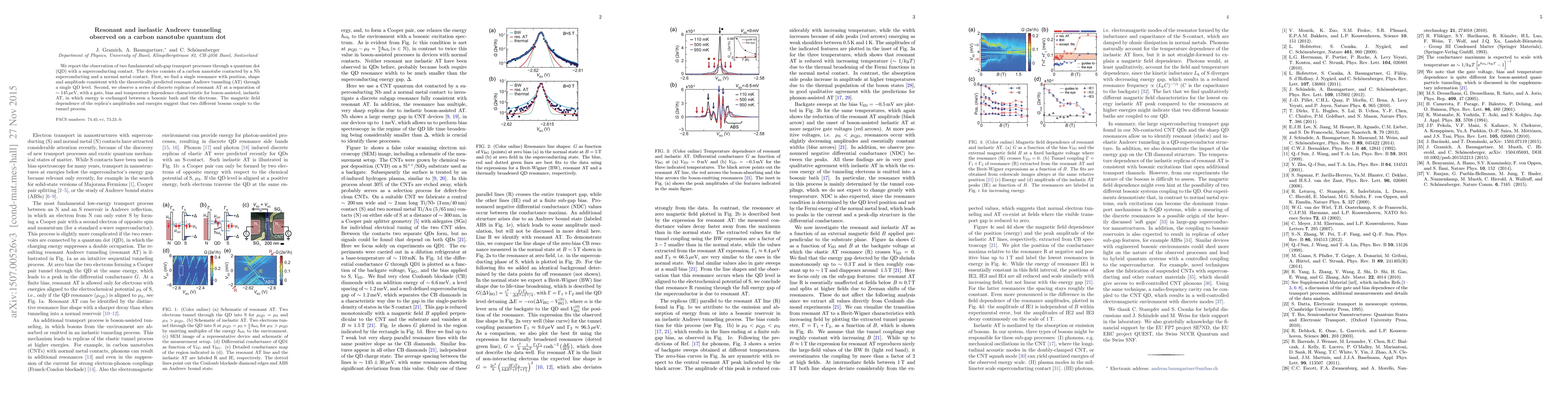 This paper reports the observation of resonant and inelastic Andreev tunneling through a carbon nanotube quantum dot with superconducting contacts. The study reveals a single resonance consistent with theoretical predictions and a series of discrete replicas indicative of boson-assisted, inelastic processes, suggesting coupling to two different bosonic modes.