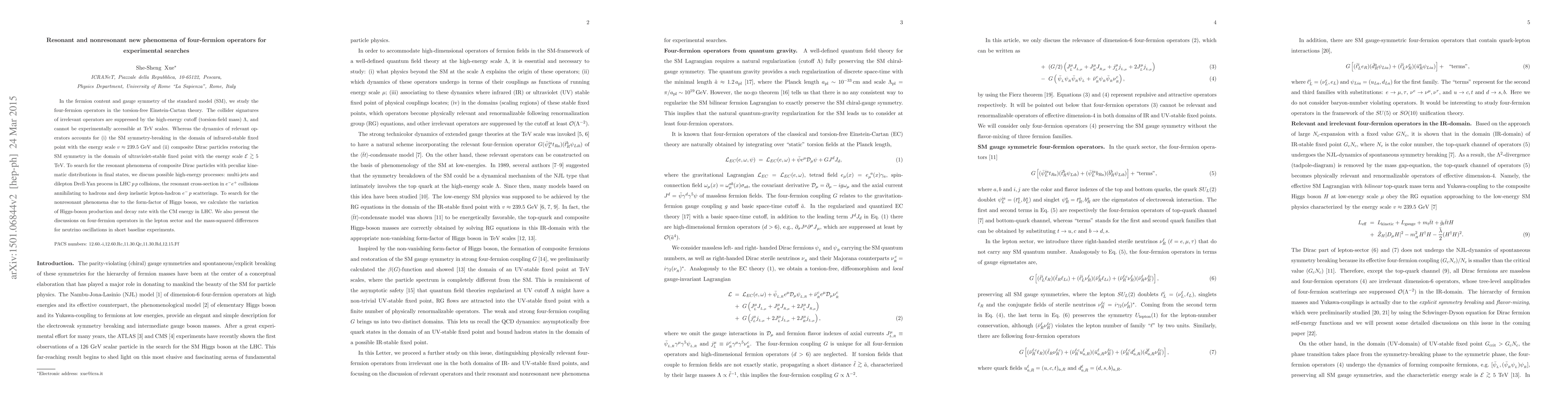 In the fermion content and gauge symmetry of the standard model (SM), we study the four-fermion operators in the torsion-free Einstein-Cartan theory. The collider signatures of irrelevant operators are suppressed by the high-energy cutoff (torsion-field mass) $\Lambda$, and cannot be experimentally accessible at TeV scales. Whereas the dynamics of relevant operators accounts for (i) the SM symmetry-breaking in the domain of infrared-stable fixed point with the energy scale $v\approx 239.5$ GeV and (ii) composite Dirac particles restoring the SM symmetry in the domain of ultraviolet-stable fixed point with the energy scale ${\mathcal E}\gtrsim 5$ TeV. To search for the resonant phenomena of composite Dirac particles with peculiar kinematic distributions in final states, we discuss possible high-energy processes: multi-jets and dilepton Drell-Yan process in LHC $p\,p$ collisions, the resonant cross-section in $e^-e^+$ collisions annihilating to hadrons and deep inelastic lepton-hadron $e^-\,p$ scatterings. To search for the nonresonant phenomena due to the form-factor of Higgs boson, we calculate the variation of Higgs-boson production and decay rate with the CM energy in LHC. We also present the discussions on four-fermion operators in the lepton sector and the mass-squared differences for neutrino oscillations in short baseline experiments.