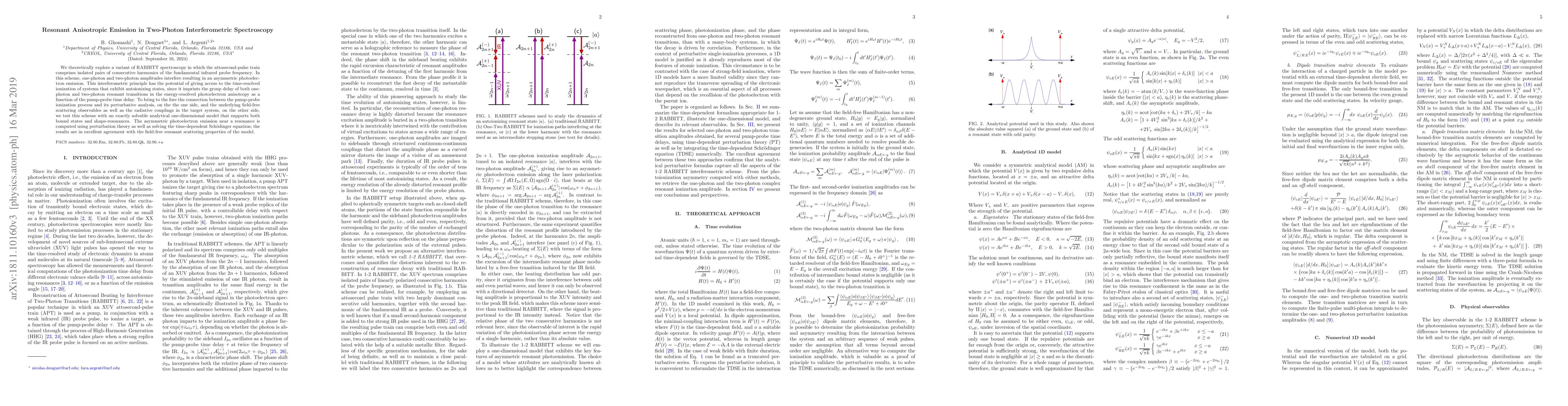 We theoretically explore a variant of RABBITT spectroscopy in which the attosecond-pulse train comprises isolated pairs of consecutive harmonics of the fundamental infrared probe frequency. In this scheme, one-photon and two-photon amplitudes interfere resulting in an asymmetric photoelectron emission. This interferometric principle has the potential of giving access to the time-resolved ionization of systems that exhibit autoionizing states, since it imprints the group delay of both one-photon and two-photon resonant transitions in the energy-resolved photoelectron anisotropy as a function of the pump-probe time delay. To bring to the fore the connection between the pump-probe ionization process and its perturbative analysis, on the the one side, and the underlying field-free scattering observables as well as the radiative couplings in the target system, on the other side, we test this scheme with an exactly solvable analytical one-dimensional model that supports both bound states and shape-resonances. The asymmetric photoelectron emission near a resonance is computed using perturbation theory as well as solving the time-dependent Sch\"odinger equation; the results are in excellent agreement with the field-free resonant scattering properties of the model.