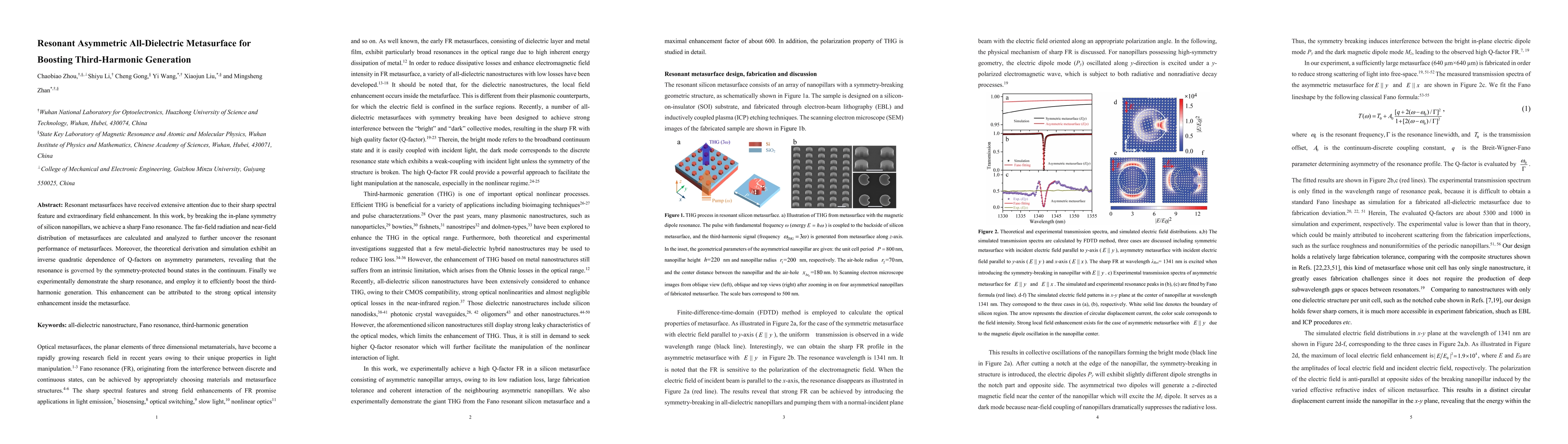 This paper presents a resonant asymmetric silicon nanopillar metasurface that induces sharp Fano resonance, which enhances third-harmonic generation efficiency through strong optical field enhancement. Theoretical and experimental results confirm the dependence of resonance on symmetry-breaking and bound states in the continuum.