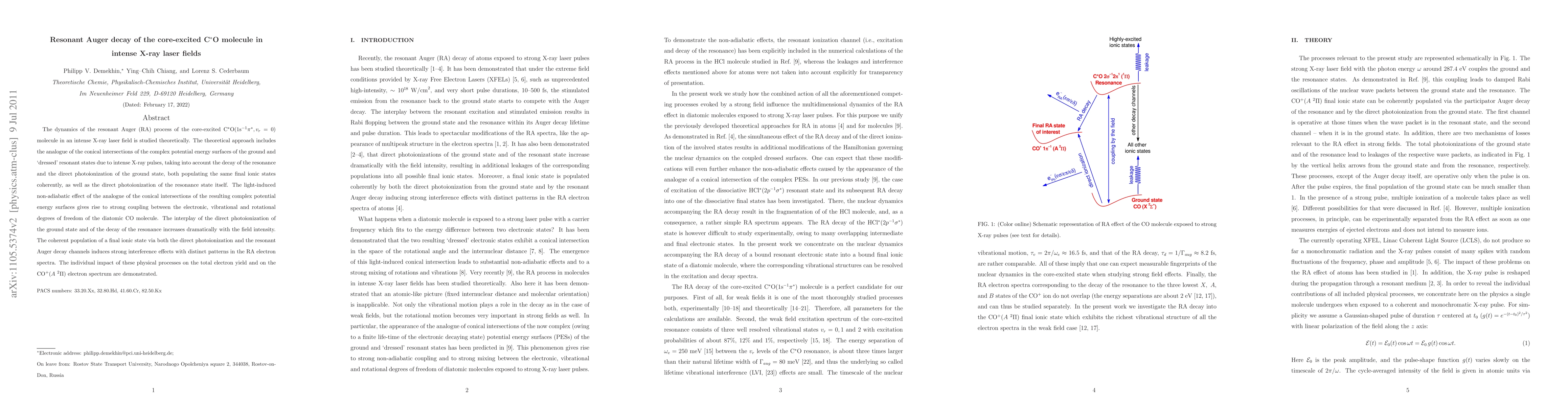 The dynamics of the resonant Auger (RA) process of the core-excited C$^\ast$O(1s$^{-1}\pi^\ast,v_r=0$) molecule in an intense X-ray laser field is studied theoretically. The theoretical approach includes the analogue of the conical intersections of the complex potential energy surfaces of the ground and `dressed' resonant states due to intense X-ray pulses, taking into account the decay of the resonance and the direct photoionization of the ground state, both populating the same final ionic states coherently, as well as the direct photoionization of the resonance state itself. The light-induced non-adiabatic effect of the analogue of the conical intersections of the resulting complex potential energy surfaces gives rise to strong coupling between the electronic, vibrational and rotational degrees of freedom of the diatomic CO molecule. The interplay of the direct photoionization of the ground state and of the decay of the resonance increases dramatically with the field intensity. The coherent population of a final ionic state via both the direct photoionization and the resonant Auger decay channels induces strong interference effects with distinct patterns in the RA electron spectra. The individual impact of these physical processes on the total electron yield and on the CO$^+(A^2\Pi)$ electron spectrum are demonstrated.