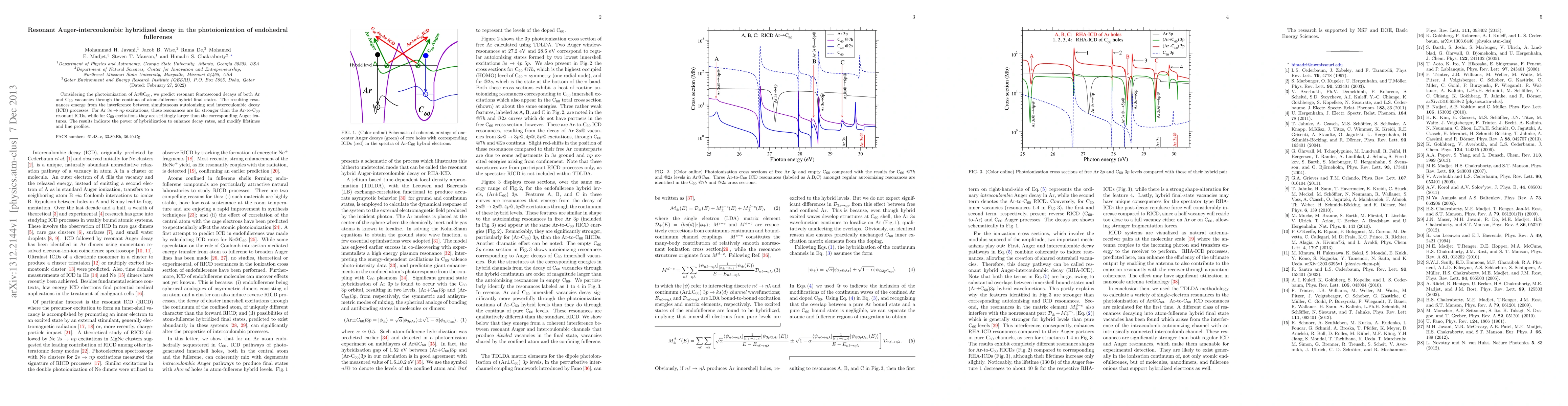 Considering the photoionization of Ar@C60, we predict resonant femtosecond decays of both Ar and C60 vacancies through the continua of atom-fullerene hybrid final states. The resulting resonances emerge from the interference between simultaneous autoionizing and intercoulombic decay (ICD) processes. For Ar 3s-->np excitations, these resonances are far stronger than the Ar-to-C60 resonant ICDs, while for C60 excitations they are strikingly larger than the corresponding Auger features. The results indicate the power of hybridization to enhance decay rates, and modify lifetimes and line profiles.