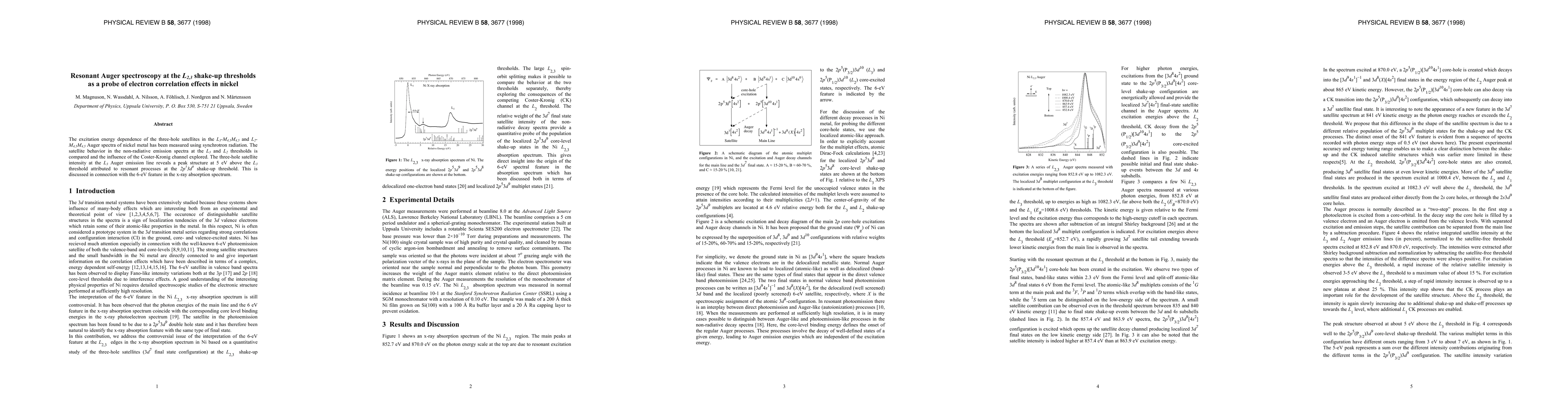 The excitation energy dependence of the three-hole satellites in the L3-M4,5M4,5 and L2-M4,5M4,5 Auger spectra of nickel metal has been measured using synchrotron radiation. The satellite behavior in the non-radiative emission spectra at the L3 and L2 thresholds is compared and the influence of the Coster-Kronig channel explored. The three-hole satellite intensity at the L3 Auger emission line reveals a peak structure at 5 eV above the L3 threshold attributed to resonant processes at the 2p53d9 shake-up threshold. This is discussed in connection with the 6-eV feature in the x-ray absorption spectrum.