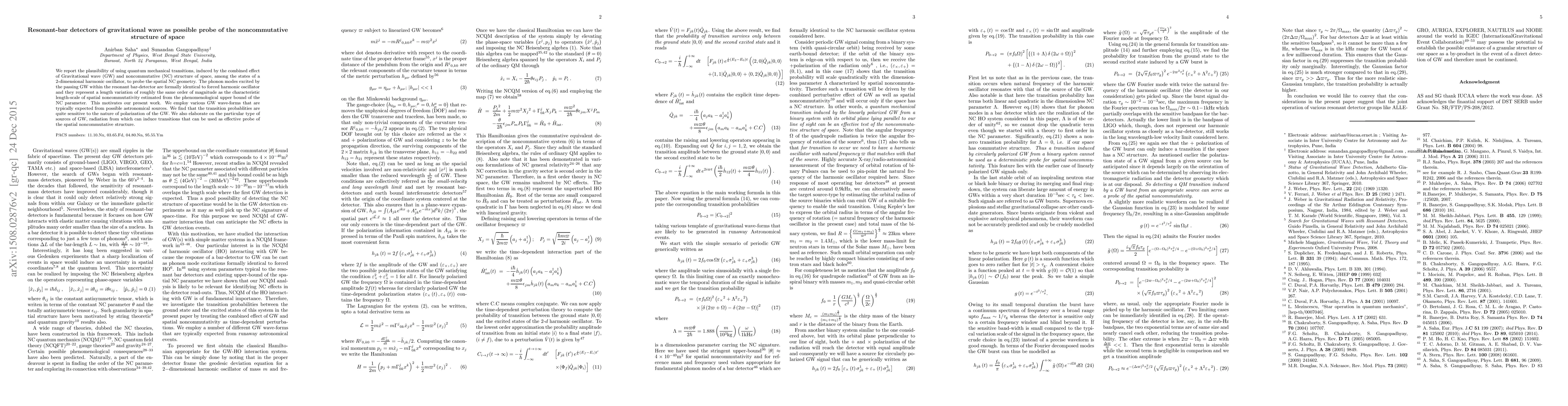 This paper explores the potential of resonant-bar detectors to detect gravitational waves (GW) and use quantum mechanical transitions induced by GW and noncommutative space to probe spatial noncommutativity. The study finds that the transition probabilities are sensitive to the GW polarization and identifies specific GW sources that could effectively reveal the spatial noncommutative structure.